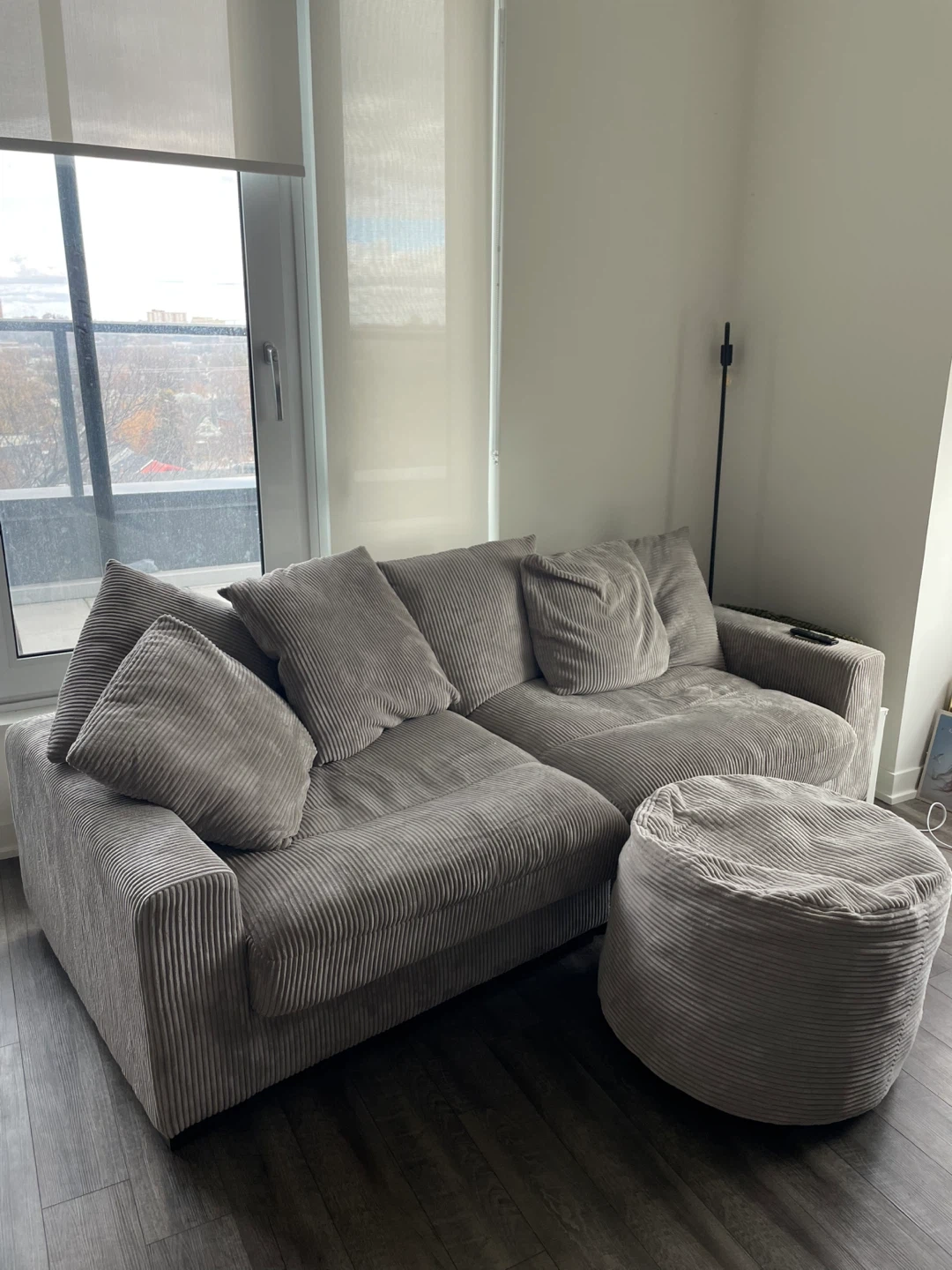 Selling a comfy cloud sectional sofa with a matching ottoman. It's in great shape and perfect for lounging. The material is a soft, corduroy-like fabric. It's a great addition to any living room less than two years old