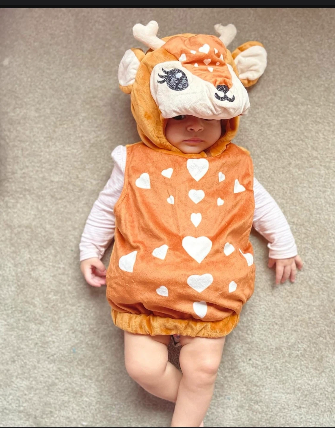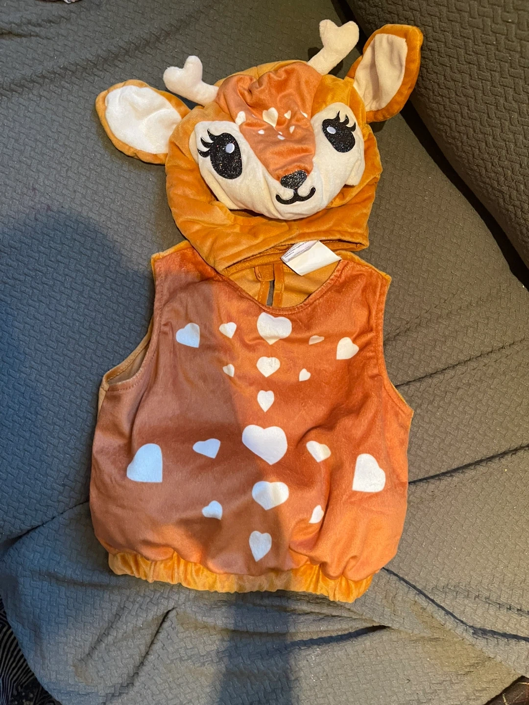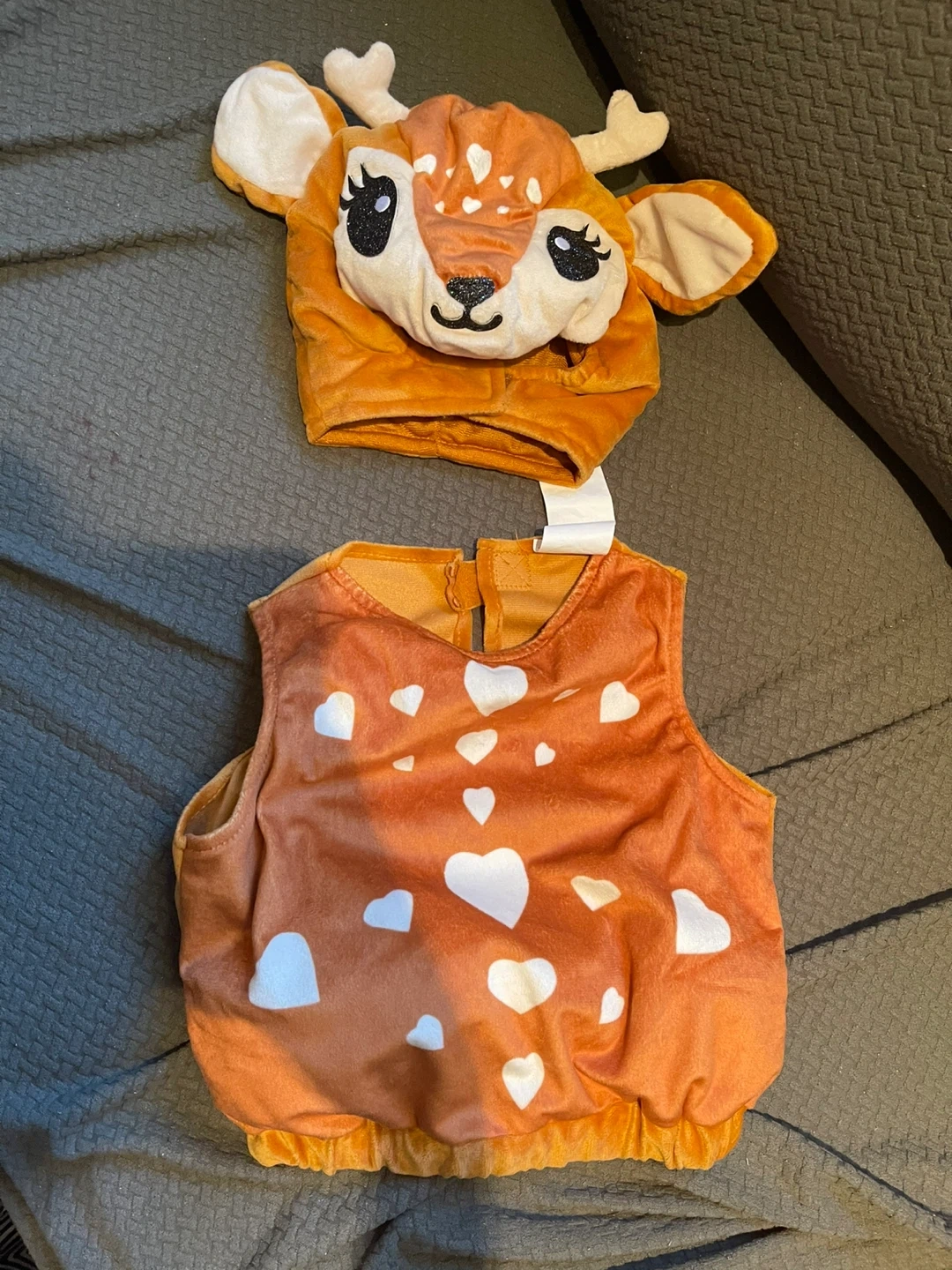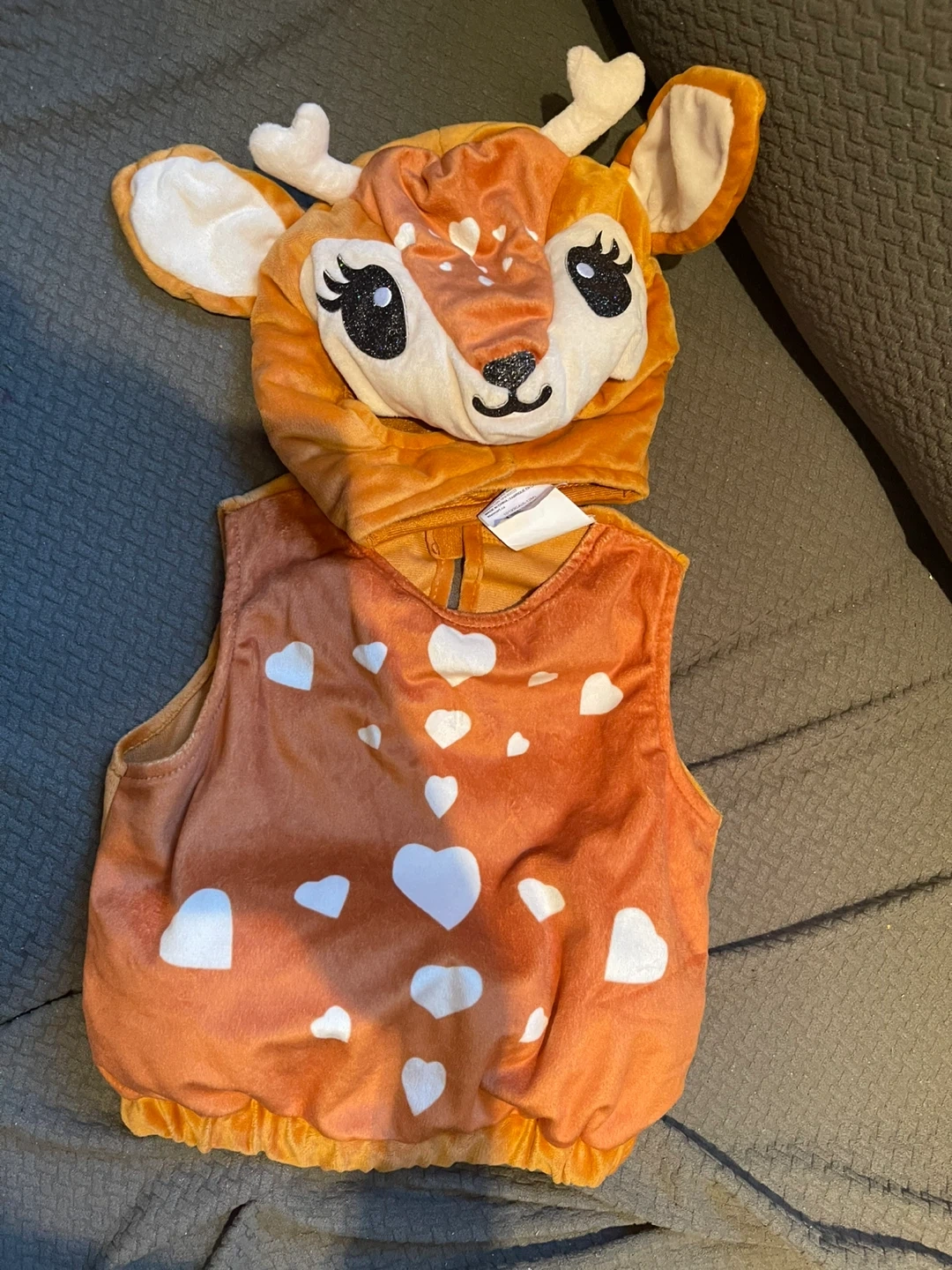20Selling a cute deer costume for babies or toddlers! It's in great condition and perfect for Halloween or dress-up. The costume includes a hooded headpiece with adorable deer features and a vest with a heart pattern. It's made of soft, plush material.