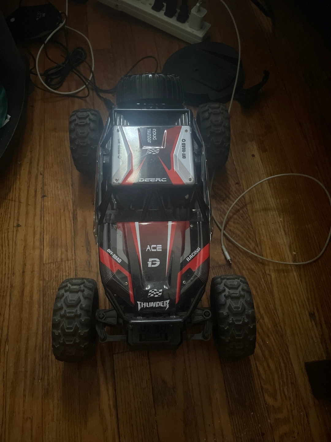 23Selling a DEERC ACE Thunder RC truck. It's in good condition and ready for some off-road fun! It has a black and red design with 'OFF-ROAD' and 'RACING' printed on the sides.