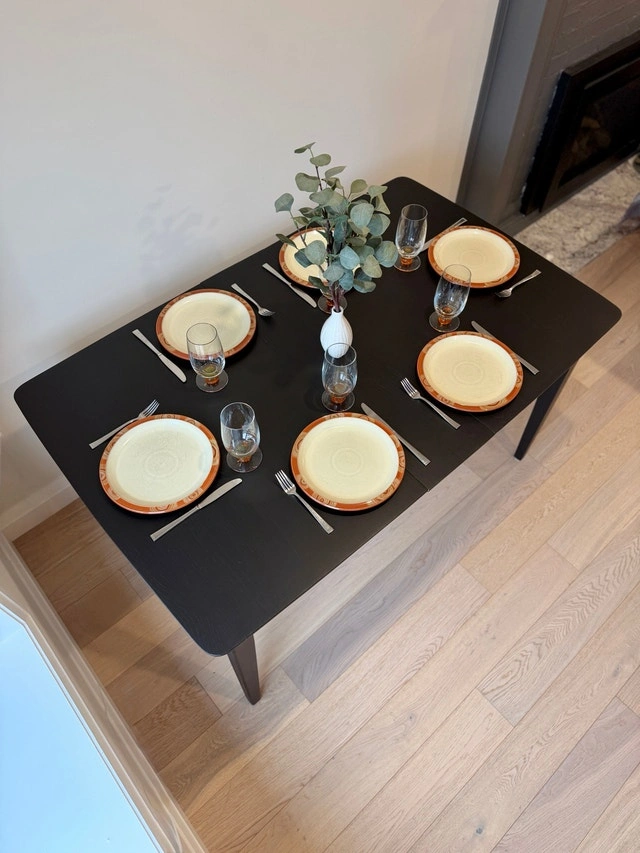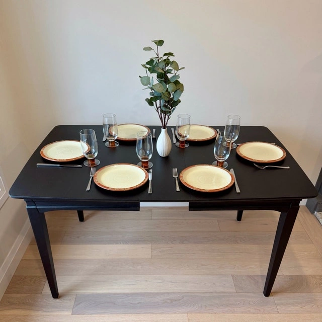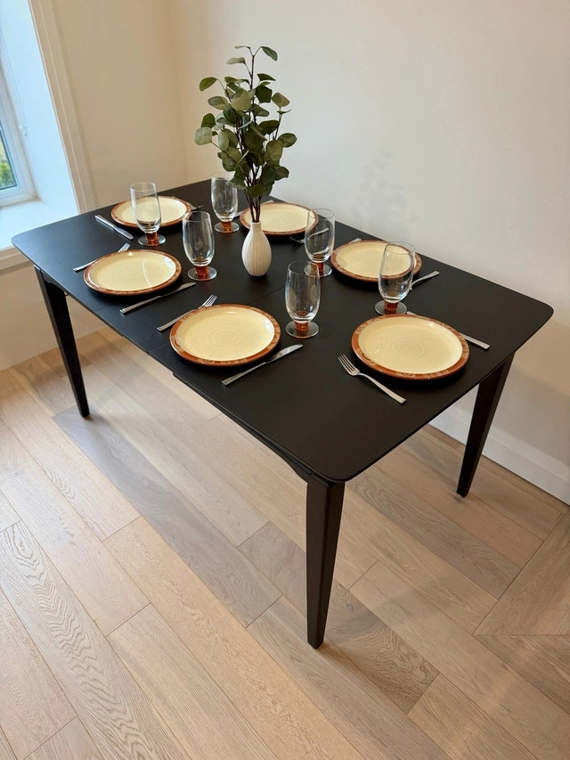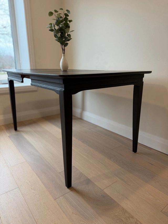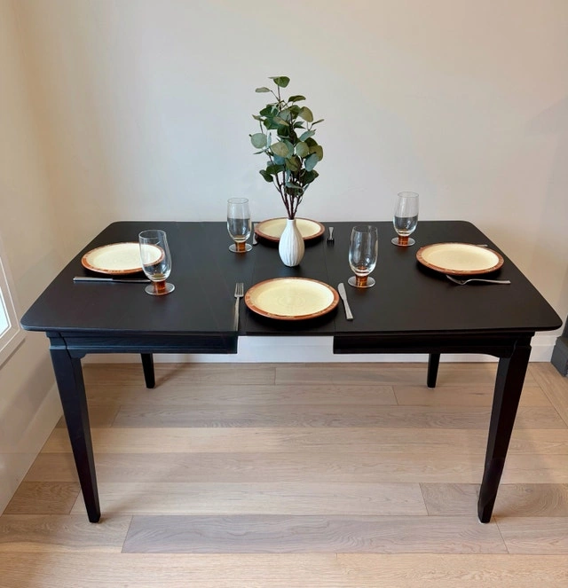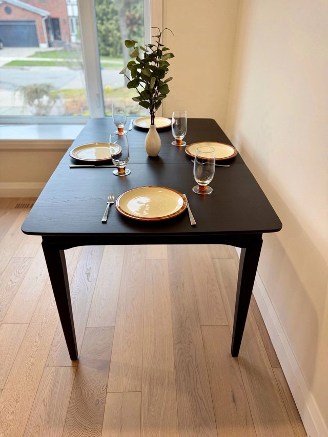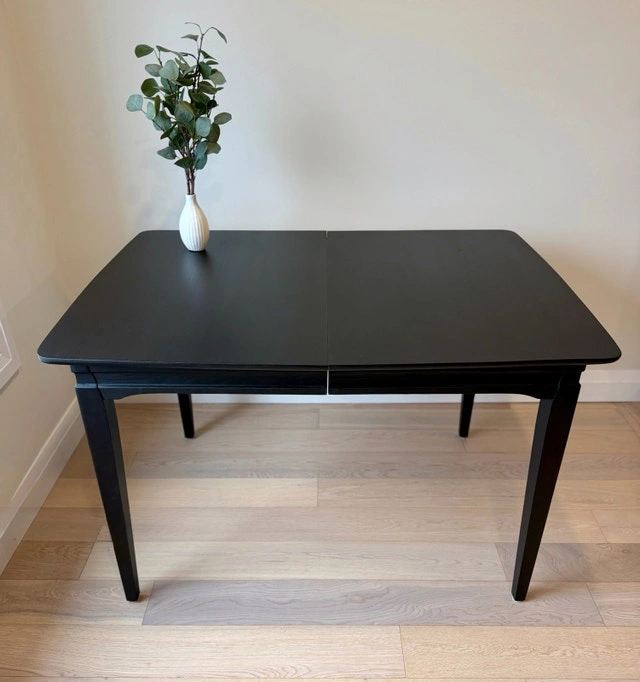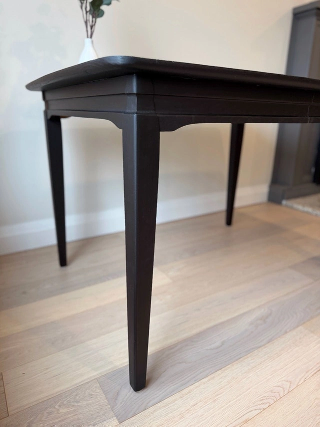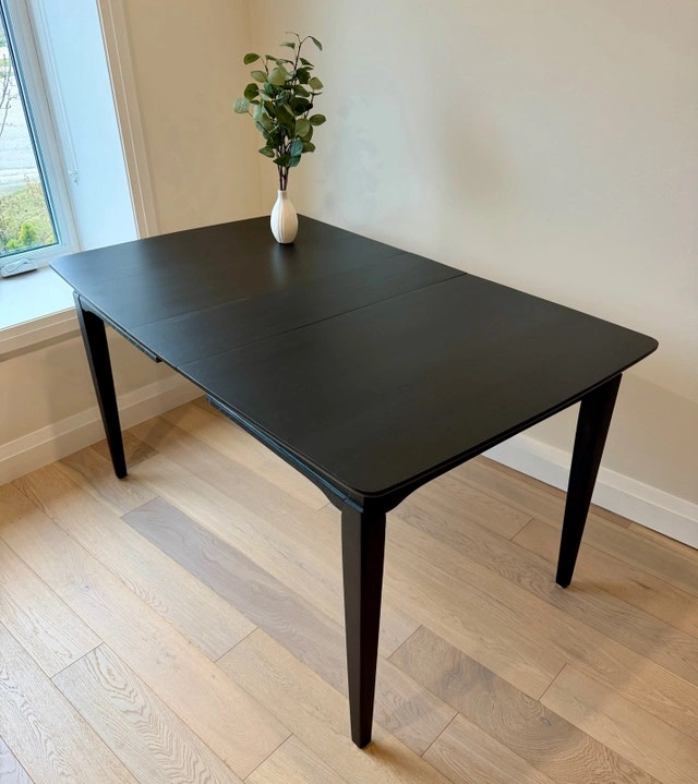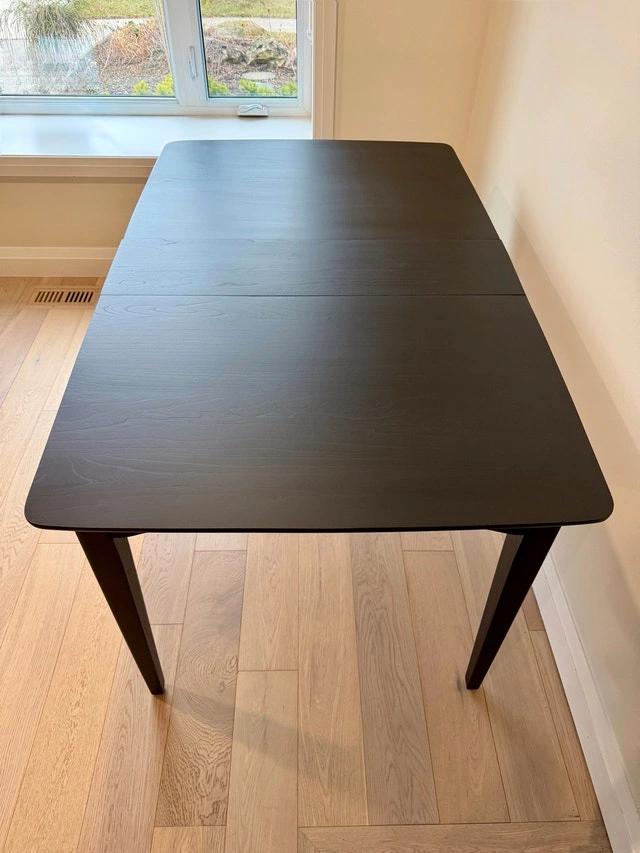 A clean, well-proportioned mid century modern dining table made in Canada by Krug. This piece has been refinished in an ebony hardwax oil, giving it a rich black tone with subtle warmth. In certain light, the legs and apron reveal a deep coffee hue, while the top reads as a smooth, even black with a soft matte sheen. Durable, repairable, and made to be lived with. Constructed from solid elm, with the grain still visible beneath the finish. The table includes a center leaf to extend for additional seating. The leaf integrates cleanly into the top. Note that the leaf does not have an apron, which is typical for this style of extension and does not affect stability or function. Simple, timeless design with tapered legs and refined edge detailing. Solid, stable, and built to last. Dimensions: Height: 30” Depth: 35.25” Length: 47.5” Extended Length: 56.75” Leaf: 9.25” Minor signs of age consistent with a vintage piece, overall in excellent condition. Pickup in Lower Stoney Creek near Dewitt Road and Highway 8. Smoke free, dog friendly home.
