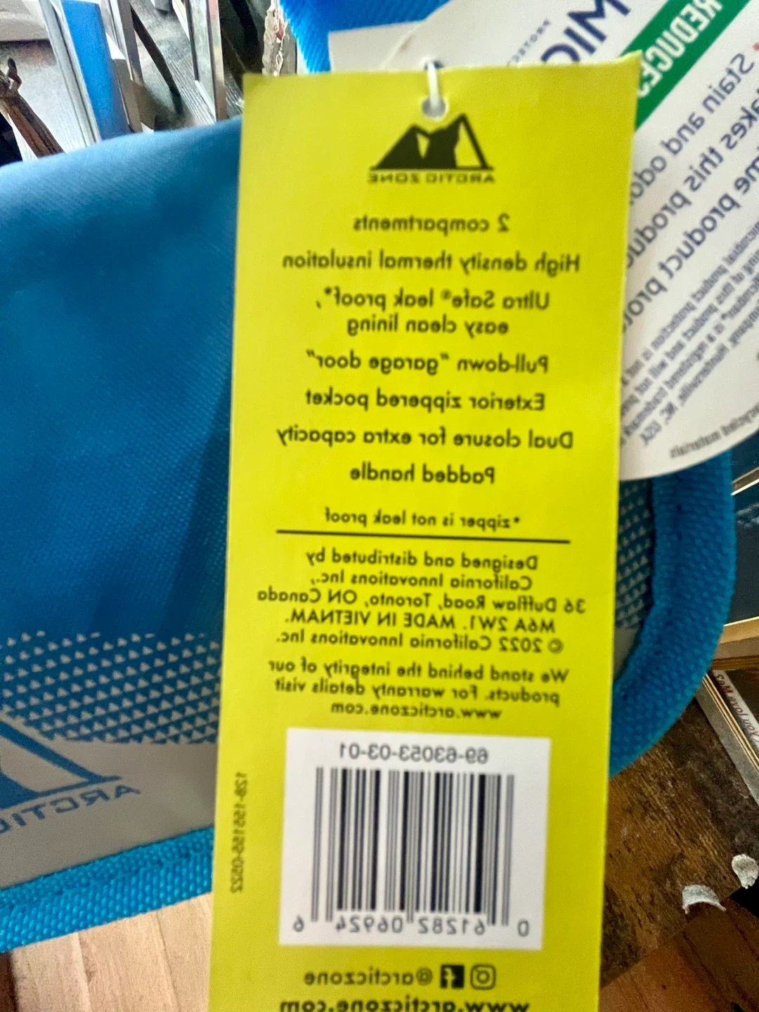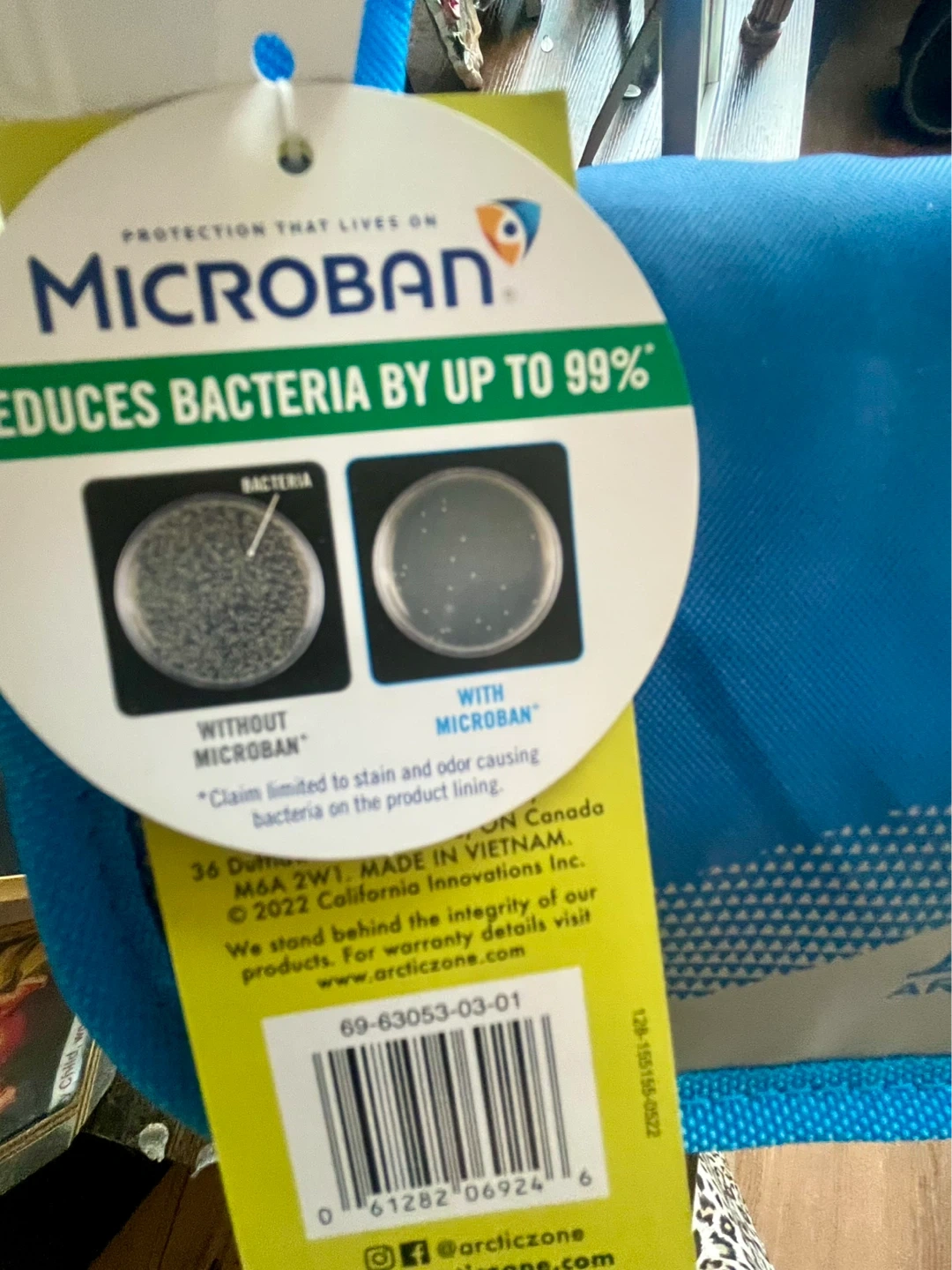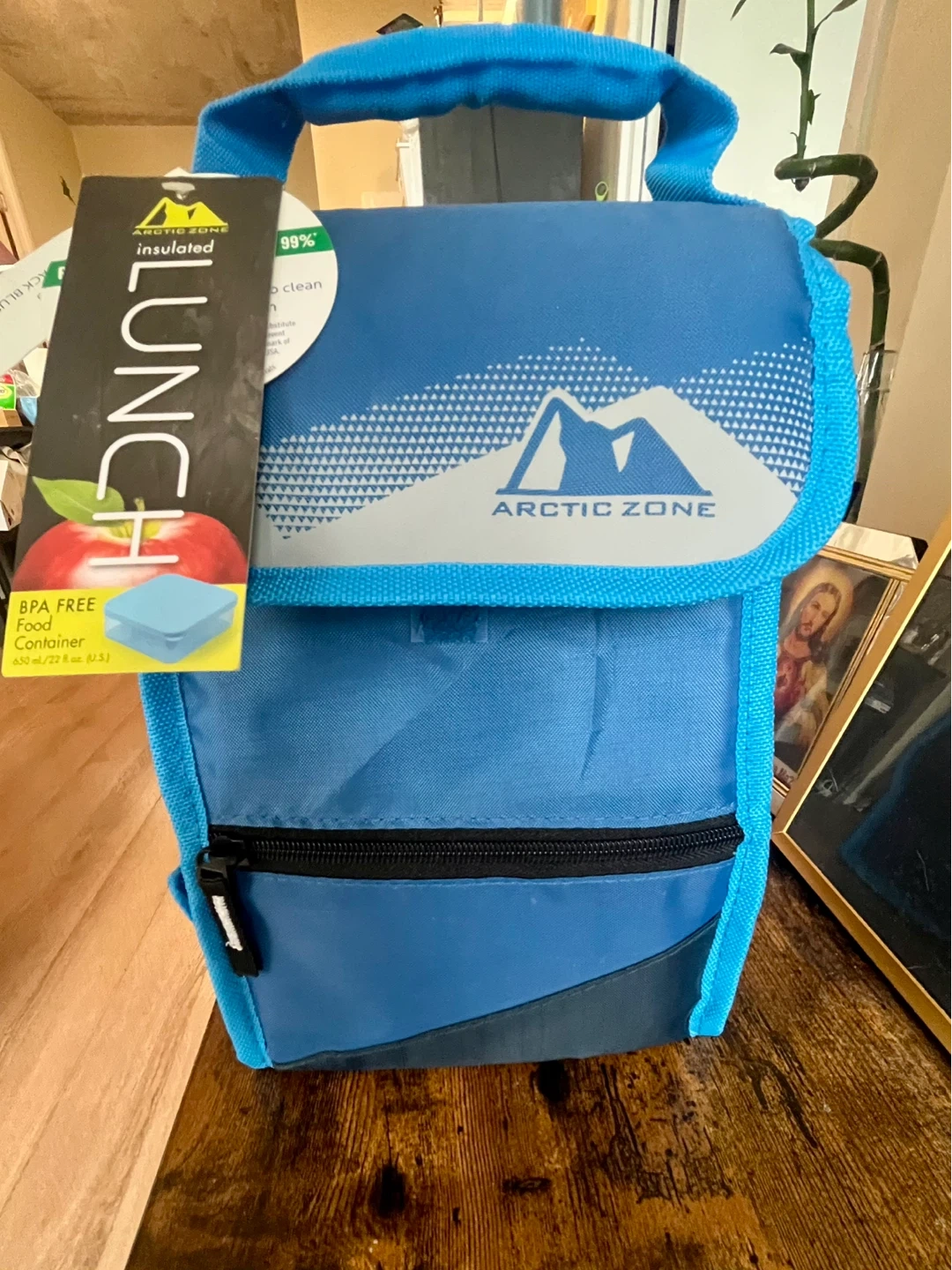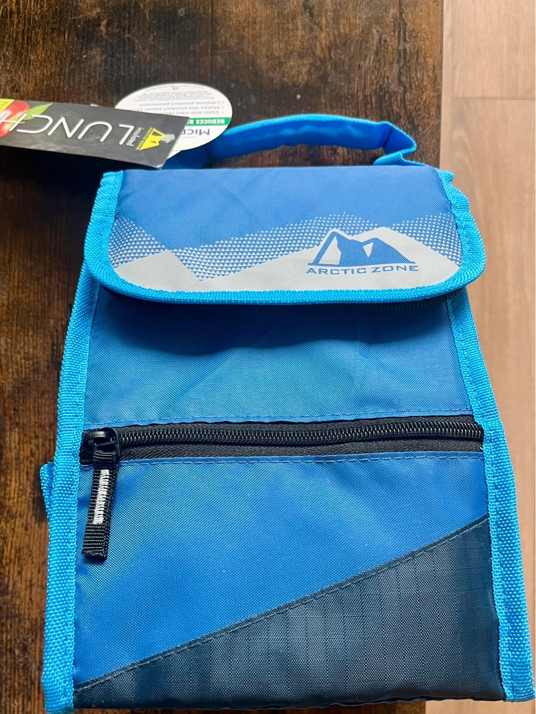 This Arctic Zone lunch bag is blue and features a pull-loop zipper for easy opening. It's insulated and made with Microban to reduce bacteria. The dual zipper allows for extra pocket capacity.