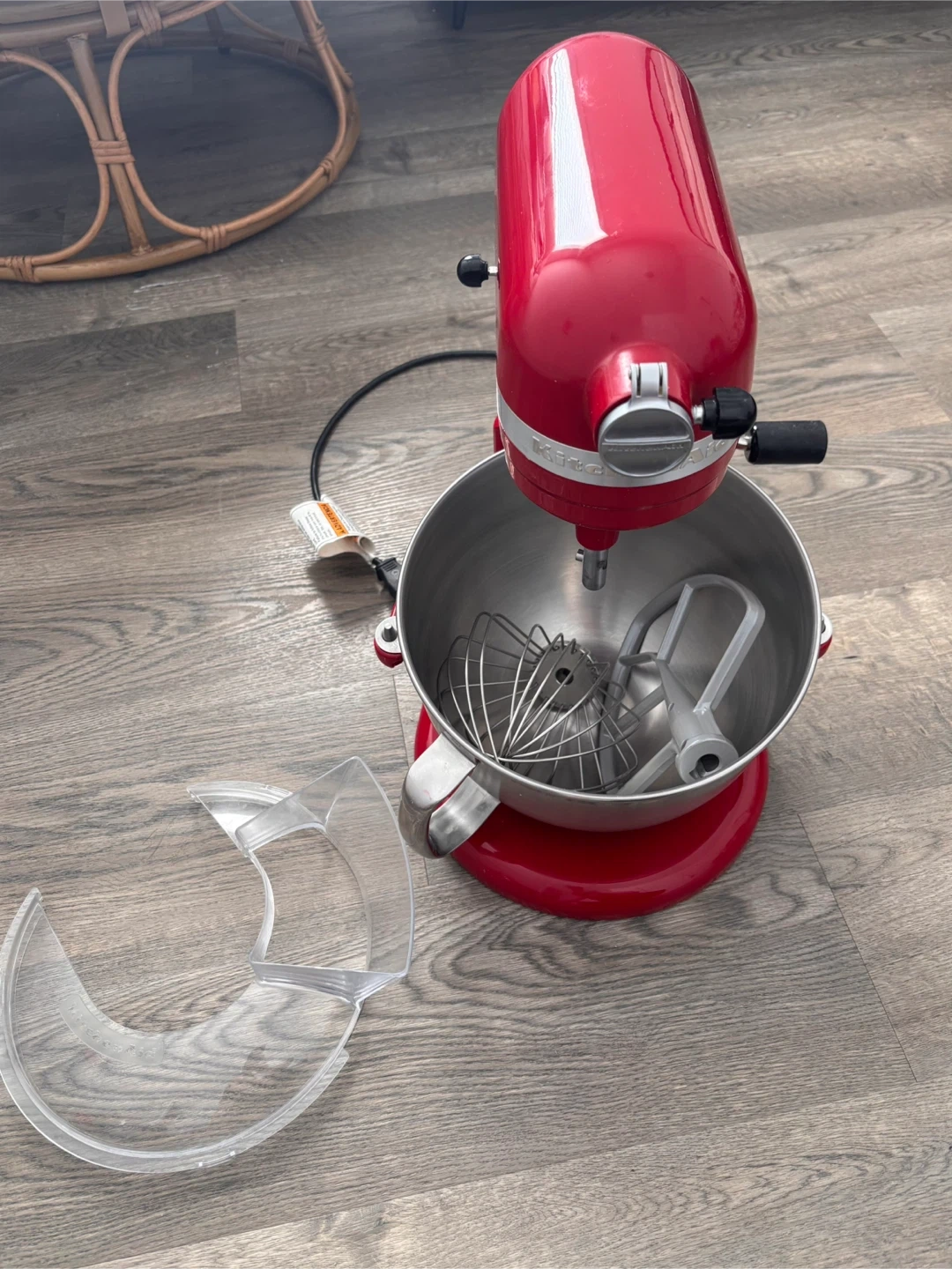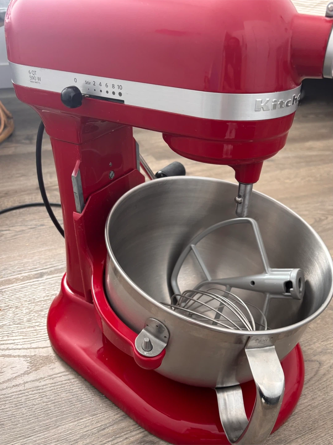 This is a red KitchenAid 6 quart stand mixer with a 590W motor. It comes with a whisk attachment, a flat beater, and a bowl. It also includes a splash guard. This mixer is great for baking and meal prep!
