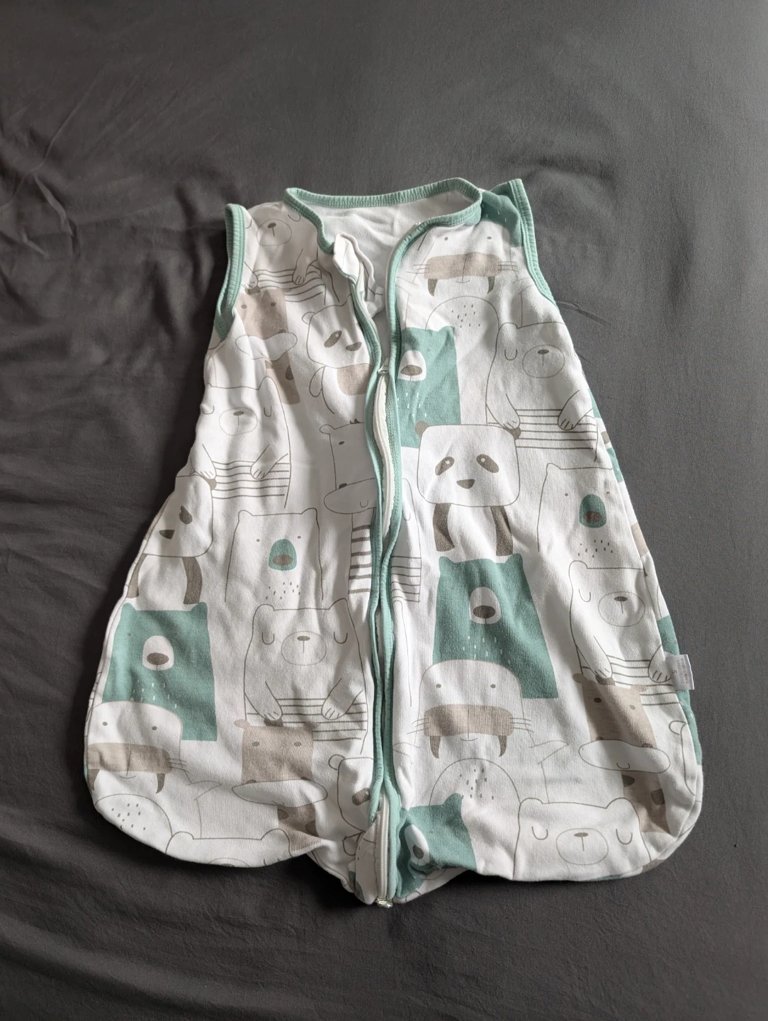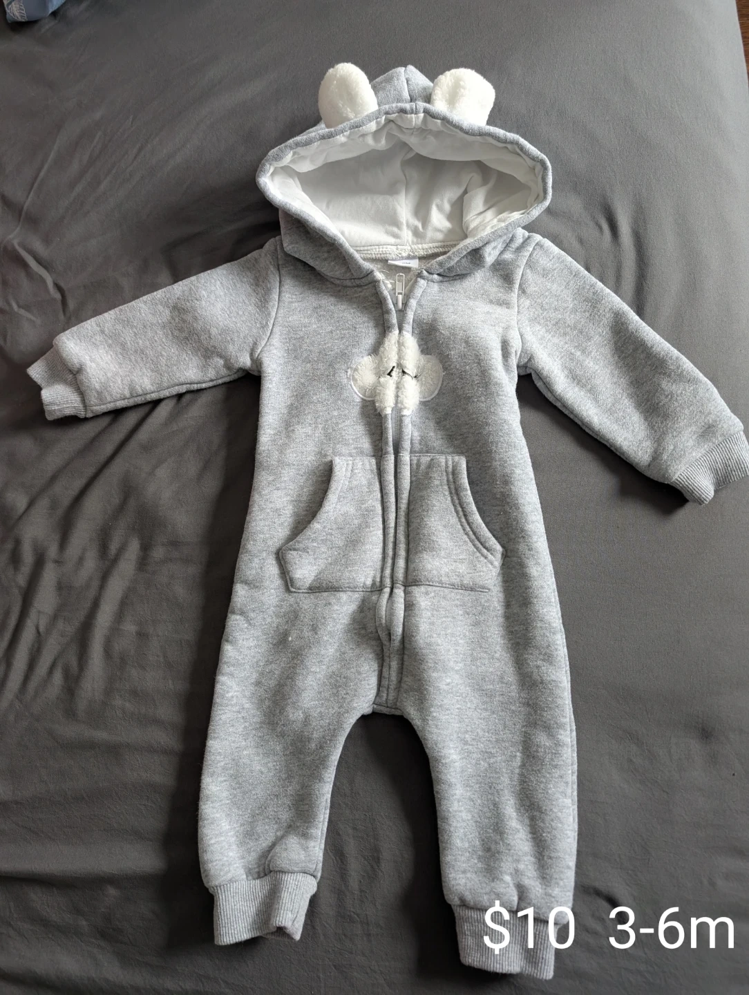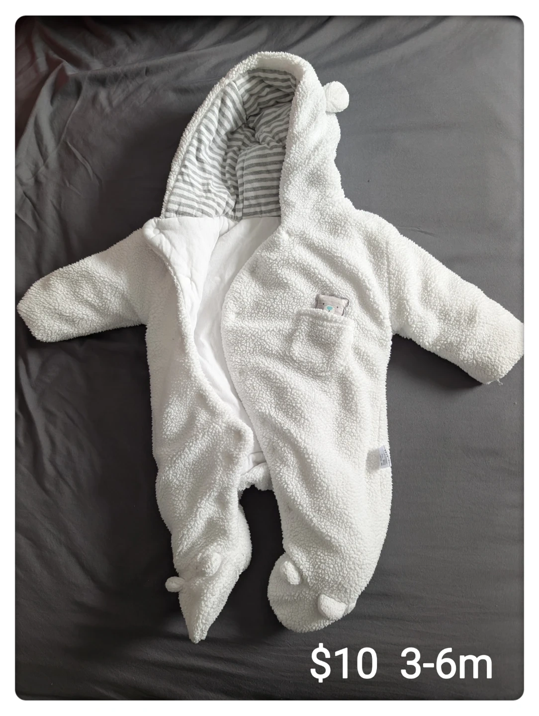 Two cozy baby outfits perfect for comfort and sleep, plus a cute patterned sleep sack. Includes a plush white bunting suit with bear ears and a soft grey fleece bunting suit. All items are in very good, like-new condition. Sizes fit 3–12 months. $10 each outfit, $5 for the sleep sack, or take everything for $20.