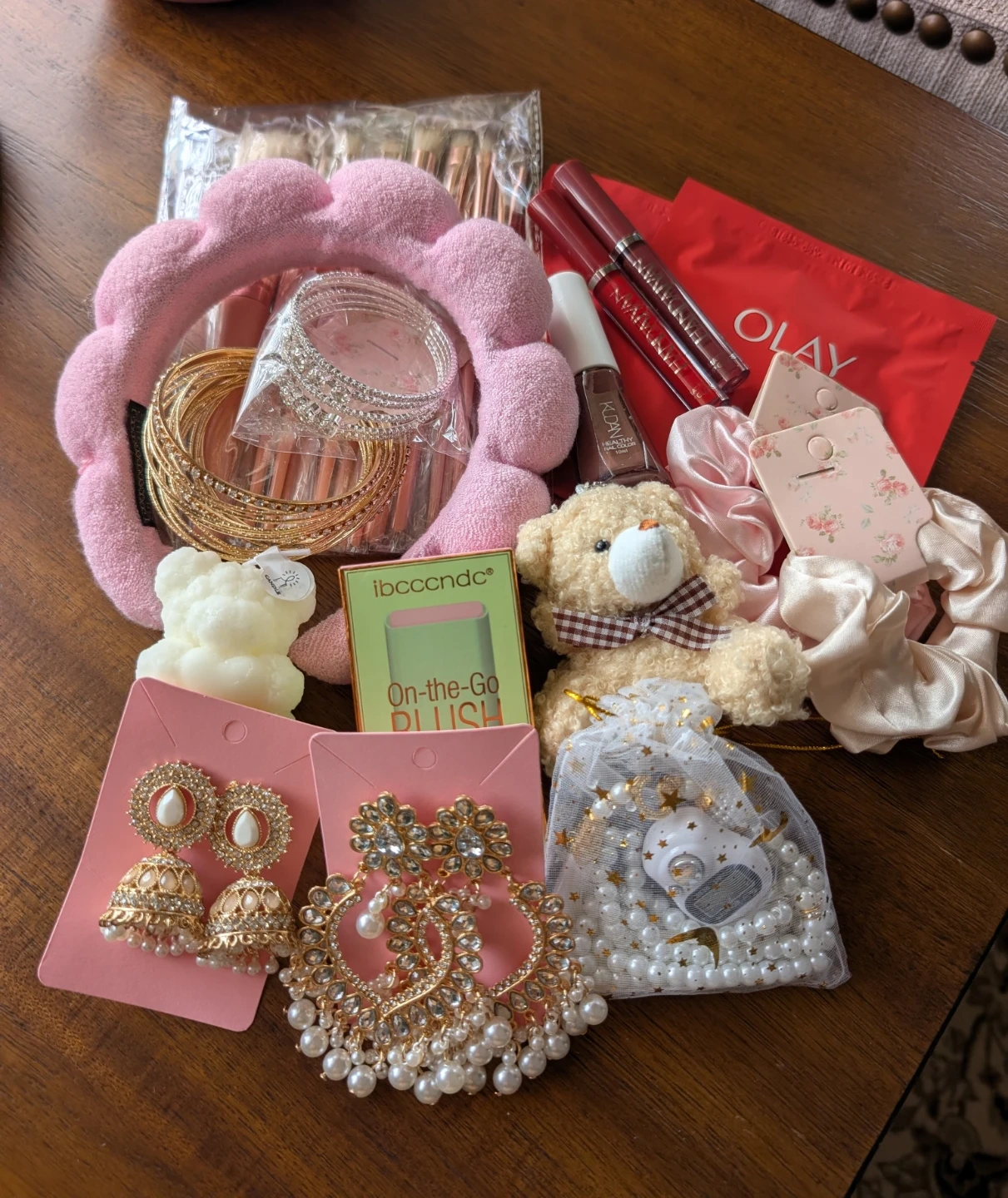 This gift basket is packed with lovely items. It includes a pink plush headband, makeup brushes set, gold bangles, bracelet, 2 decorative earrings, teddy bear candle, and a small teddy bear. You'll also find makeup like blush and 2 lip gloss, face mask, nail polish, tasbih set, plus silky scrunchies.