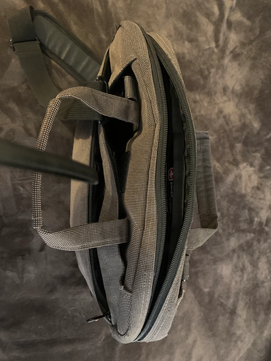 This is a Swiss Gear messenger bag. It's a grey bag with multiple zippered compartments. The interior lining is black.