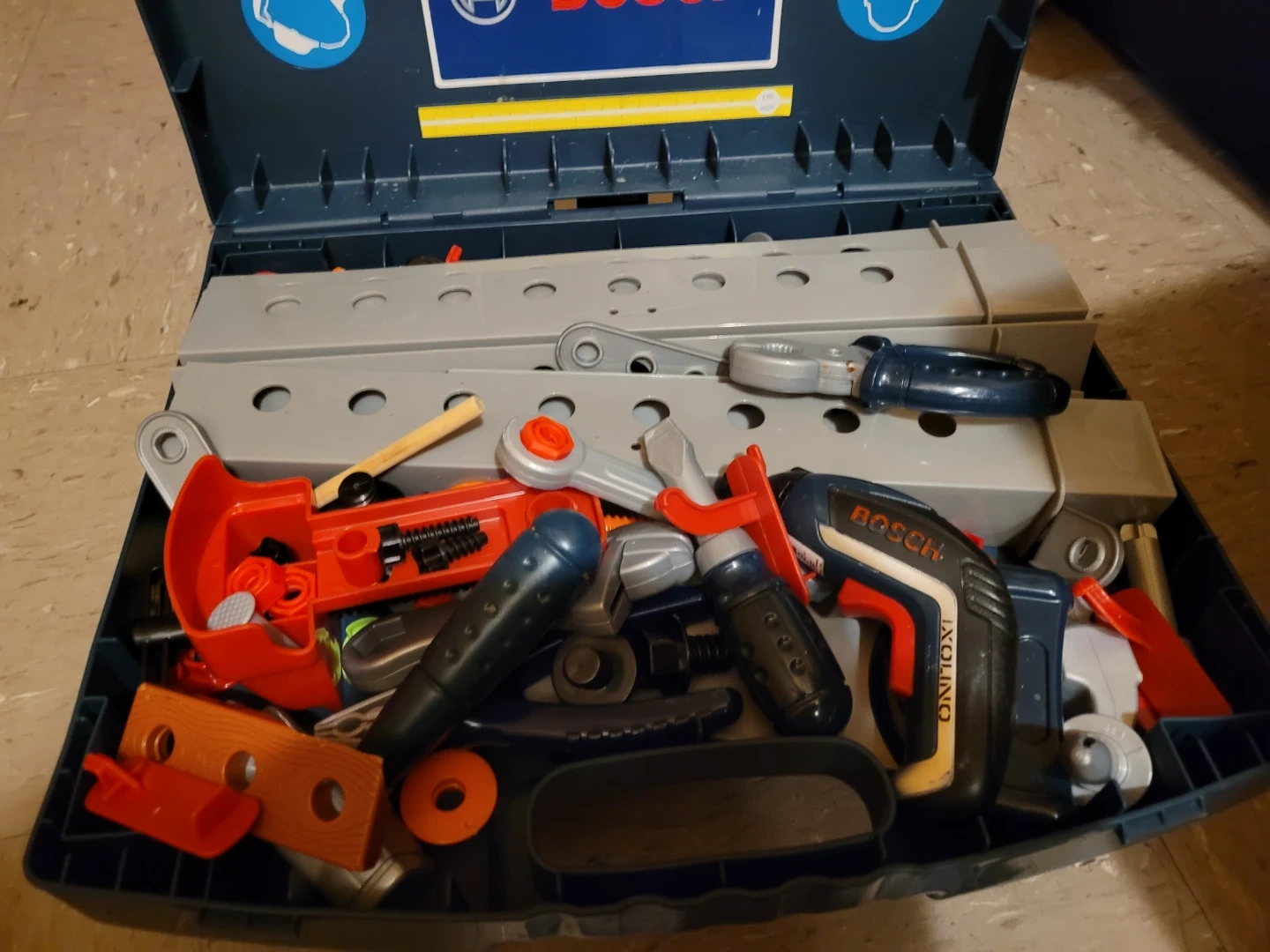 This is a Bosch toy workbench with a variety of tools and accessories. It's great for little builders and aspiring carpenters. Includes a toy drill, hammer, pliers, and more!