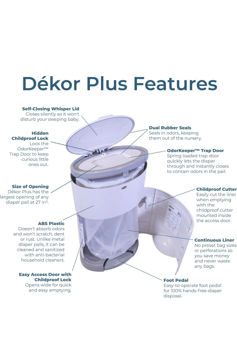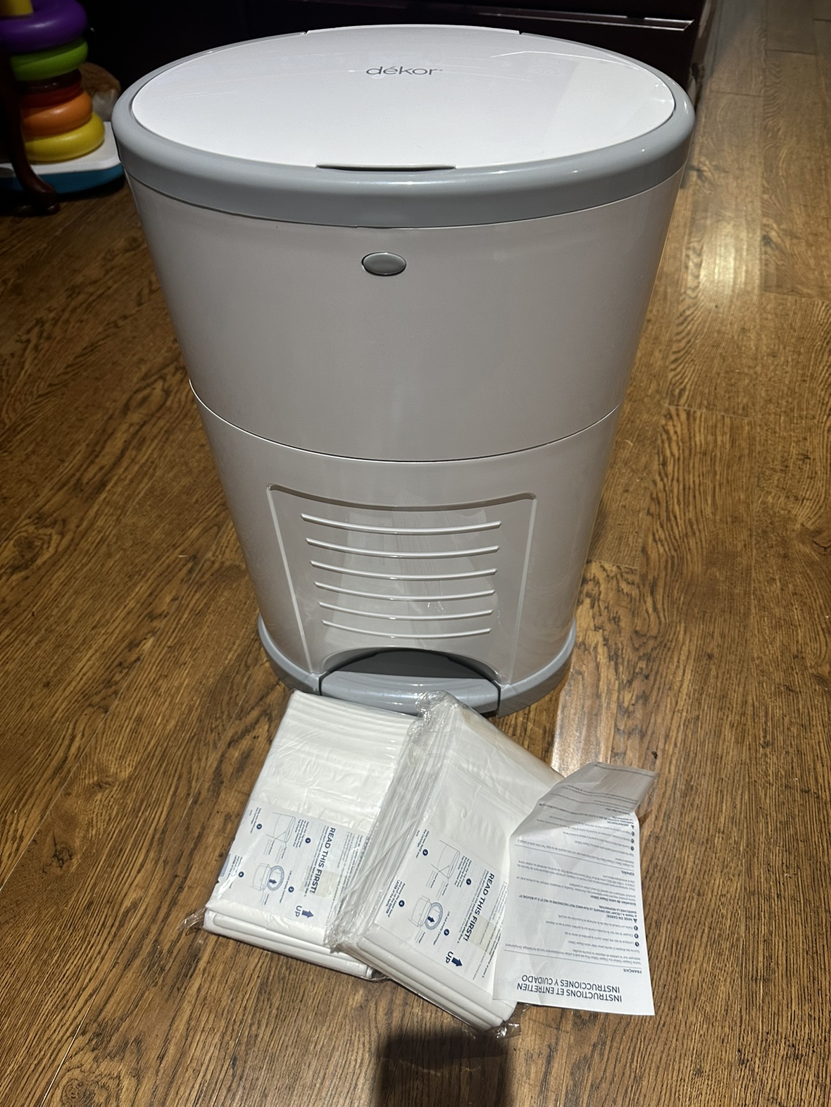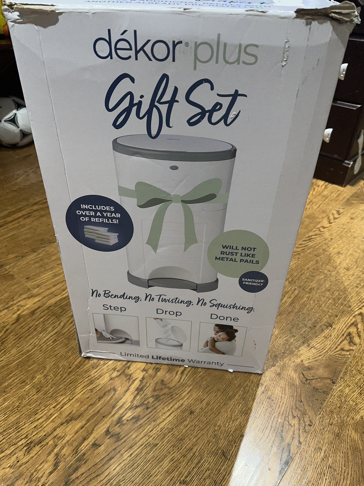 Brand new one Retail price more than $115 A great choice to gift for a new mom Brand : DEKOR Capacity : 56.63 liters Colour : Plus Gift Set Opening mechanism : Step-On Material : Plastic Recommended uses for product : diaper pail & liners Perfect Registry Gift for all New Parents: Includes One Dékor Plus Diaper Pail and Over a Year’s Worth of Dékor Refills (1 Pre-Installed, and 8 Additional Refills). Totally Hands-Free Diaper Pail: Step, Drop, Done! No Bending, No Twisting, No Squishing, Unlike Ordinary Diaper Pails! Most Cost-Effective Diaper Pail Refill System on the Market. Dékor Refill System Creates Less Waste - Use ONLY What You Need! Closed-Cell ABS Plastic that Doesn’t Absorb Odors Over Time—Works like Metal but Won't Rust, and Can be Cleaned and Disinfected with Household Cleaners, Unlike Metal Diaper Pails that Can Only be Cleaned with a Dry Cloth. Holds Up To 60 Newborn Diapers. Effective Triple Odor Control Keeps the Smell in the Pail. Pickup at northwest London or can deliver with extra pay