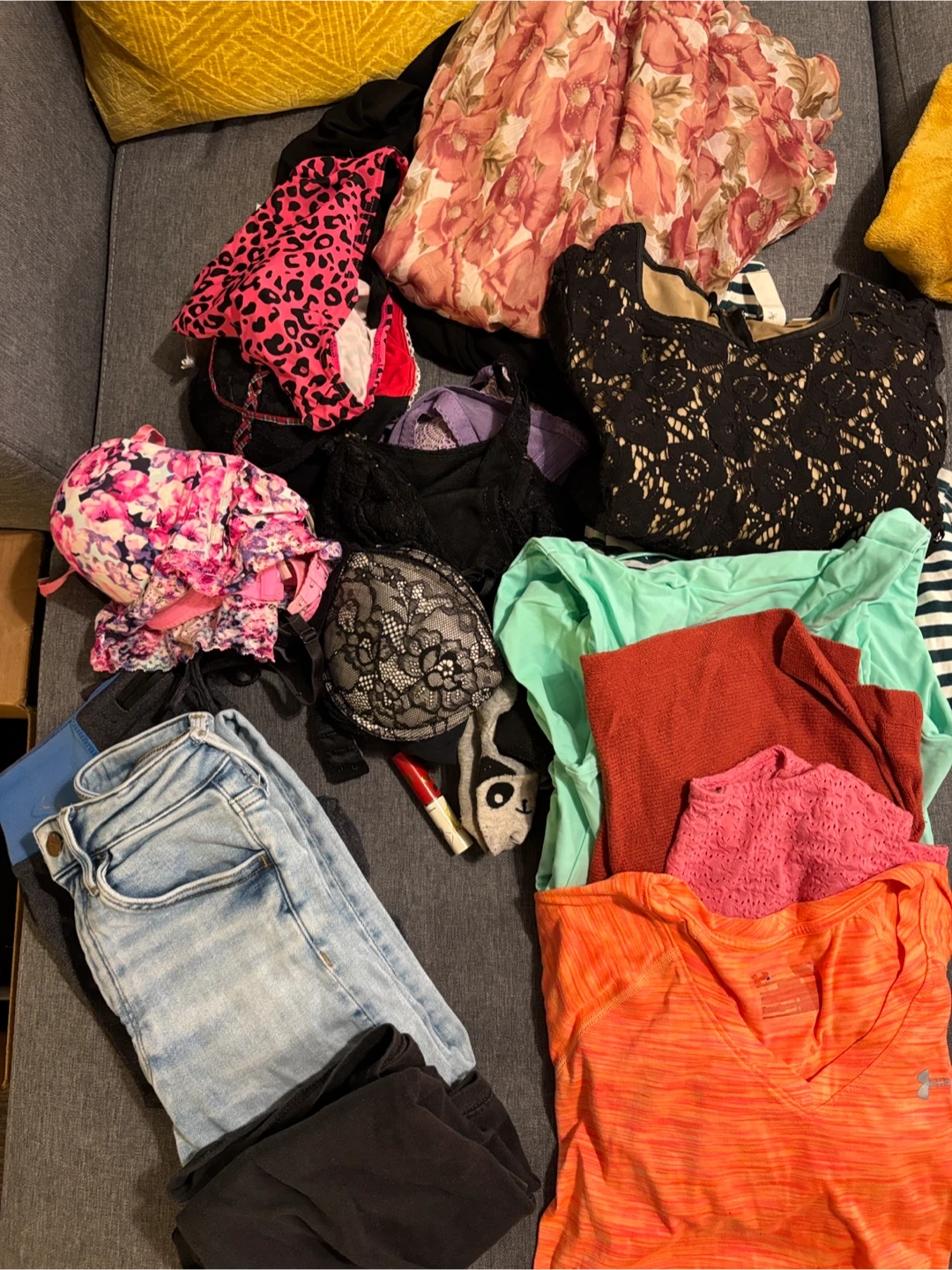 A collection of women's clothing items including jeans, tops, and lingerie. Includes light wash denim jeans, a black lace top, a floral print dress, and various coloured t-shirts. Also includes some assorted bras and a pink textured top. It's a great mix of everyday wear and some dressier pieces.
