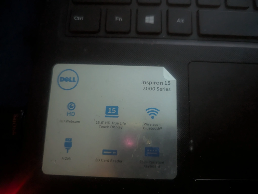 Selling a Dell Inspiron 15 3000 Series laptop. It features a 15.6" HD True Life Touch Display, HD Webcam, Wireless + Bluetooth, HDMI port, and SD Card Reader. It also has a spill-resistant keyboard