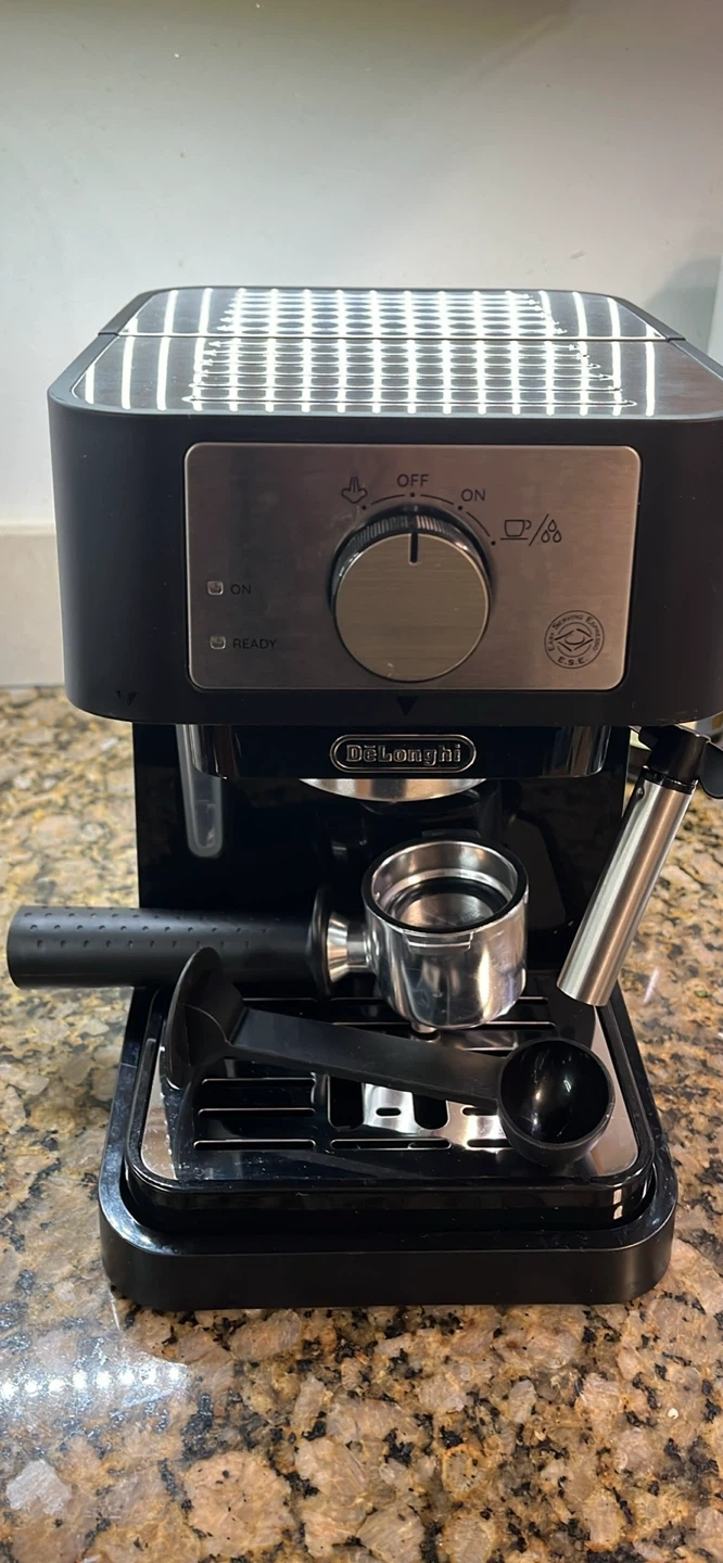 Selling a gently used DeLonghi espresso machine in black. It's in great shape and ready to make some delicious coffee! Includes the portafilter and tamper/measuring spoon