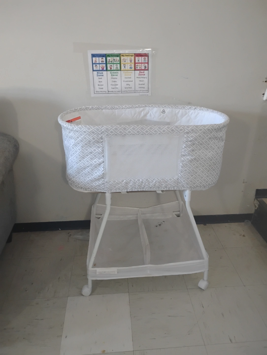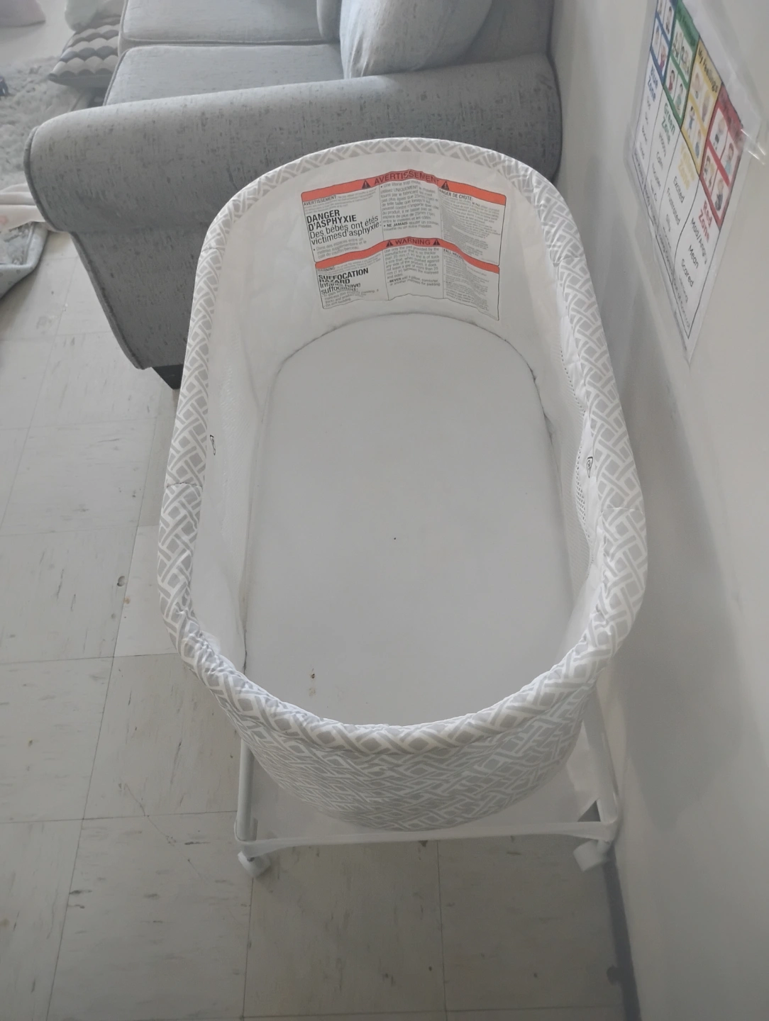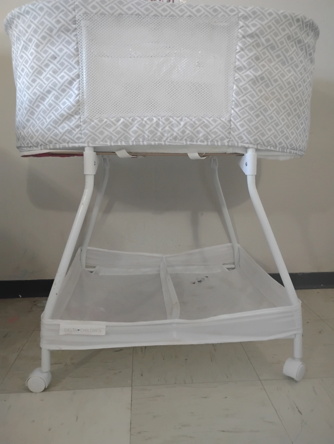 white bassinet. Includes stand with storage shelf. Wheels for easy mobility. bassinet mattress included. no rips, no tears.