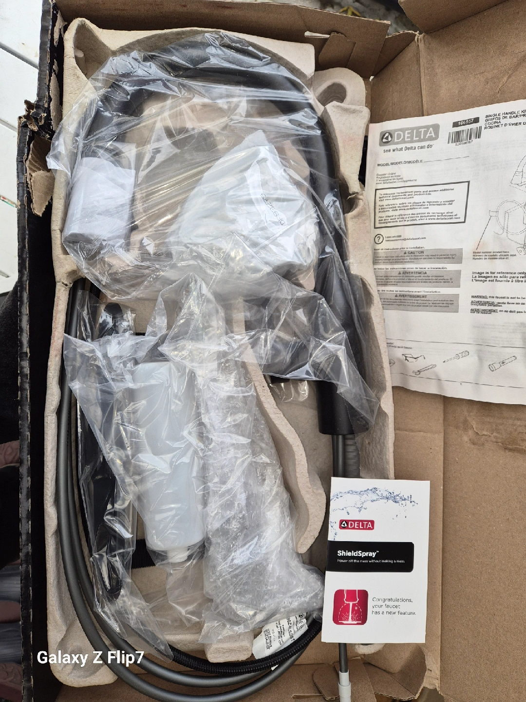 89Selling a Delta Marca single-handle pull-down kitchen faucet in matte black. It's brand new and comes with the box and all original components. Features ShieldSpray Technology! Great for any kitchen upgrade
