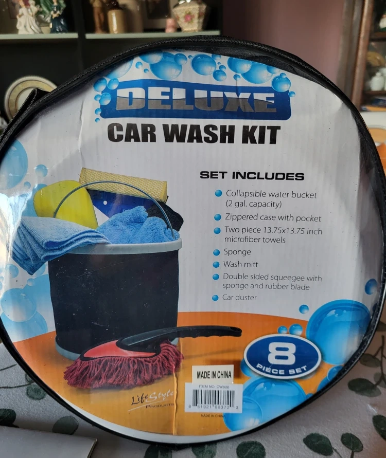 70I have a brand new Deluxe Car Wash Kit, still in its original zippered case! This 8-piece set includes: - Collapsible water bucket (2 gal capacity) - Zippered case with pocket - Two 13.75x13.75 inch microfiber towels - Sponge - Wash mitt - Double sided squeegee with sponge and rubber blade - Car duster Great gift for that car enthusiast! Cash only please. Thanks.