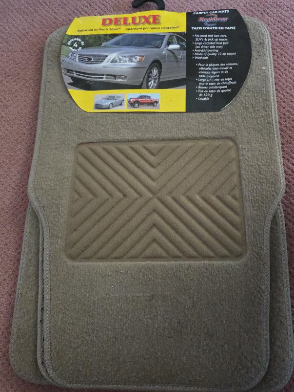Keep your car clean with these Deluxe carpet car mats! They fit most mid-size cars, SUVs, and pick-up trucks. They feature a large carpeted heel pad on the driver's side mat and have anti-skid backing. Made of quality 22 oz carpet and are washable!