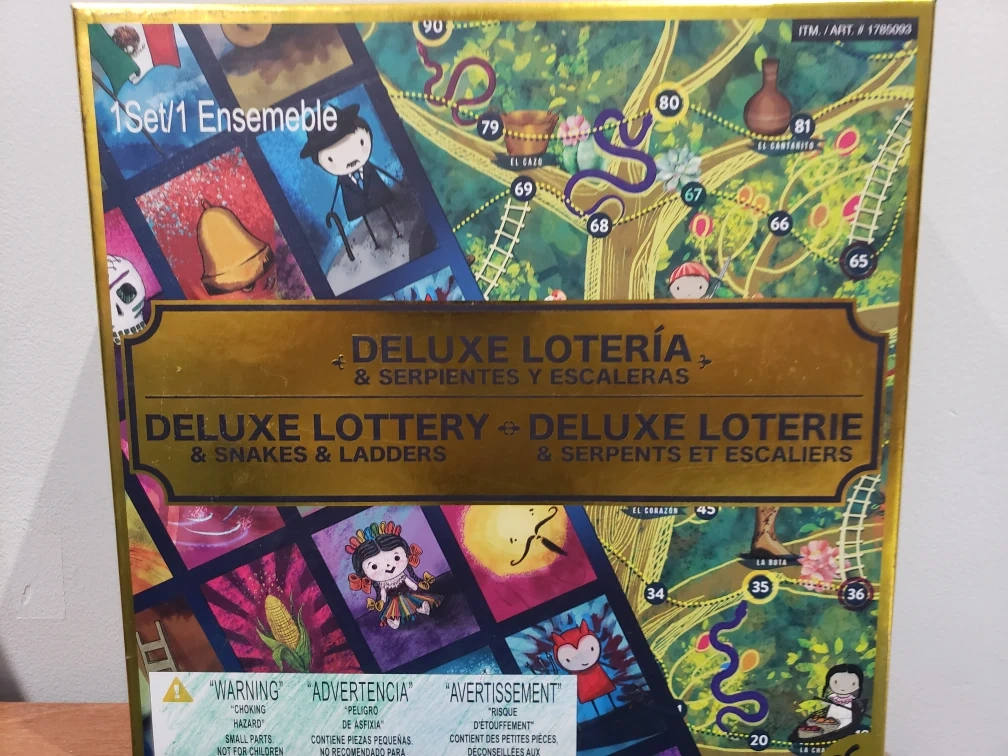 Selling a Deluxe Loteria & Serpientes y Escaleras board game. It includes: - 8 wooden boards - 120 crystal chips - Plastic cards This game is for 2-6 players.