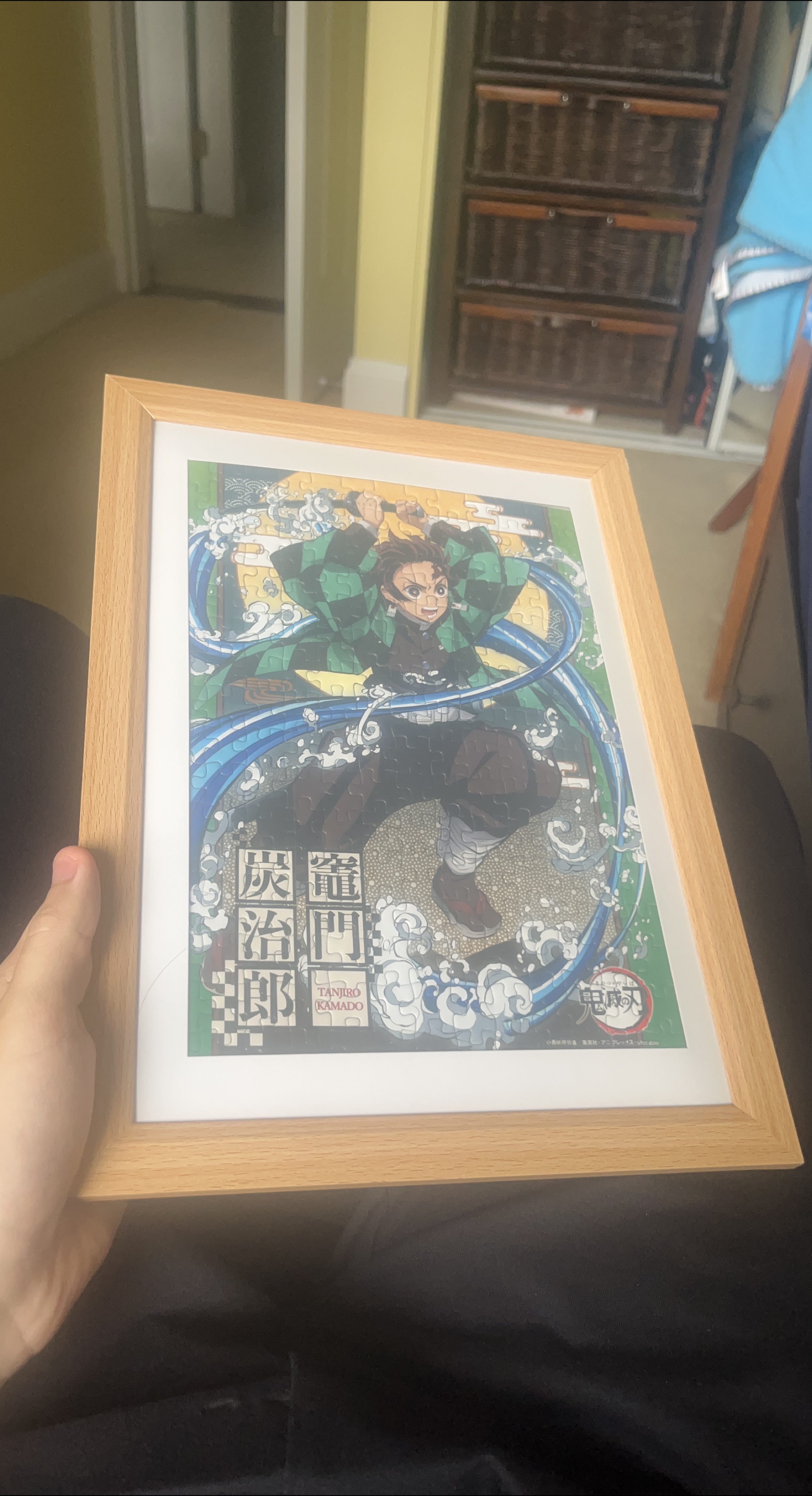 Selling a framed jigsaw puzzle featuring Tanjiro Kamado from Demon Slayer! It's in great condition and ready to hang up and enjoy. All the pieces are glued together. So no you can’t re build it unless you cut it up