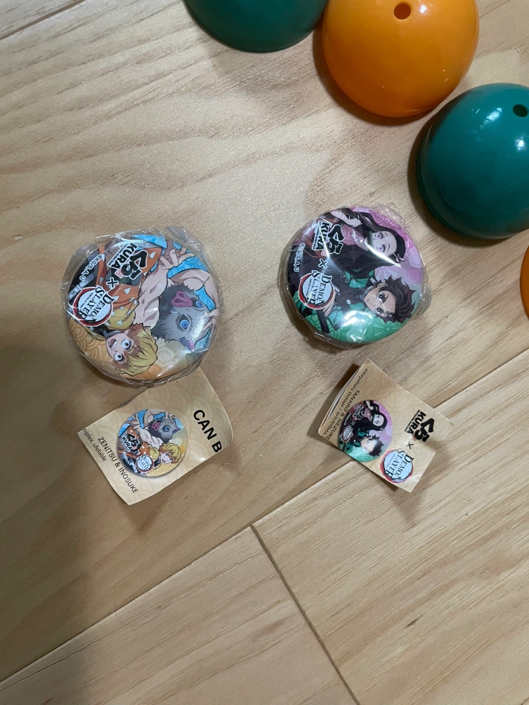 Two Demon Slayer x Kura Sushi collaboration can badges in original packaging. One features Zenitsu & Inosuke, the other features Tanjiro and friends! Great for any Demon Slayer fan