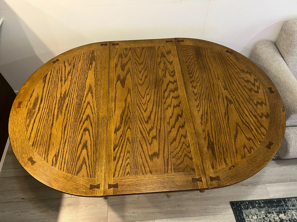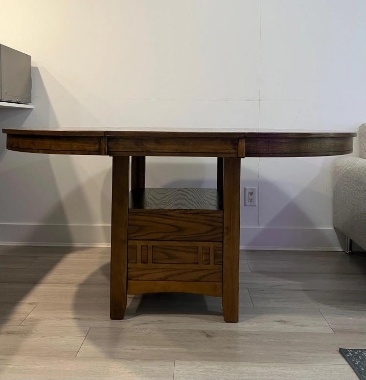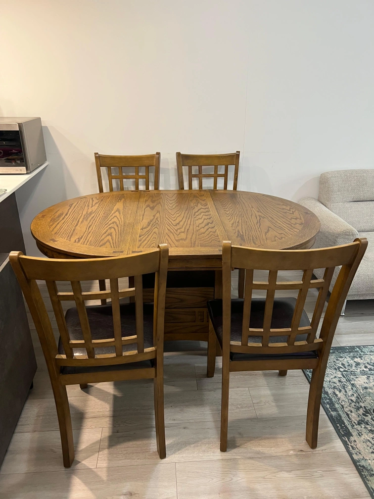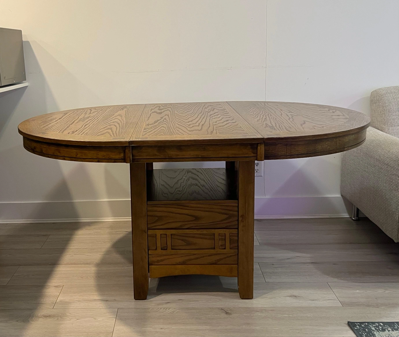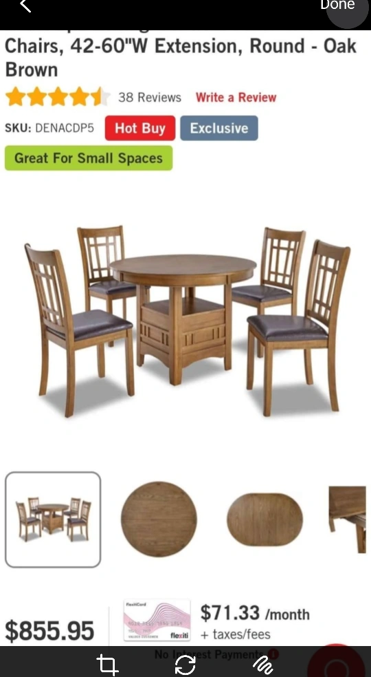 10Like New!!!! Gather your family, large or small, around this five-piece Dena oak-finished dining package to break bread and make memories. Oak veneers are applied over a rubberwood base to create an appealing look. Meanwhile, high-density foam makes sitting through multiple courses or hours of homework comfortable, as the leather-look cover offers breathability with style. A compact design allows this set to fit into a limited area – yet if everyone comes over, use the removable table leaf for an extra 18 inches of space. Put this Dena five-piece set at the heart of your family's magical moments.