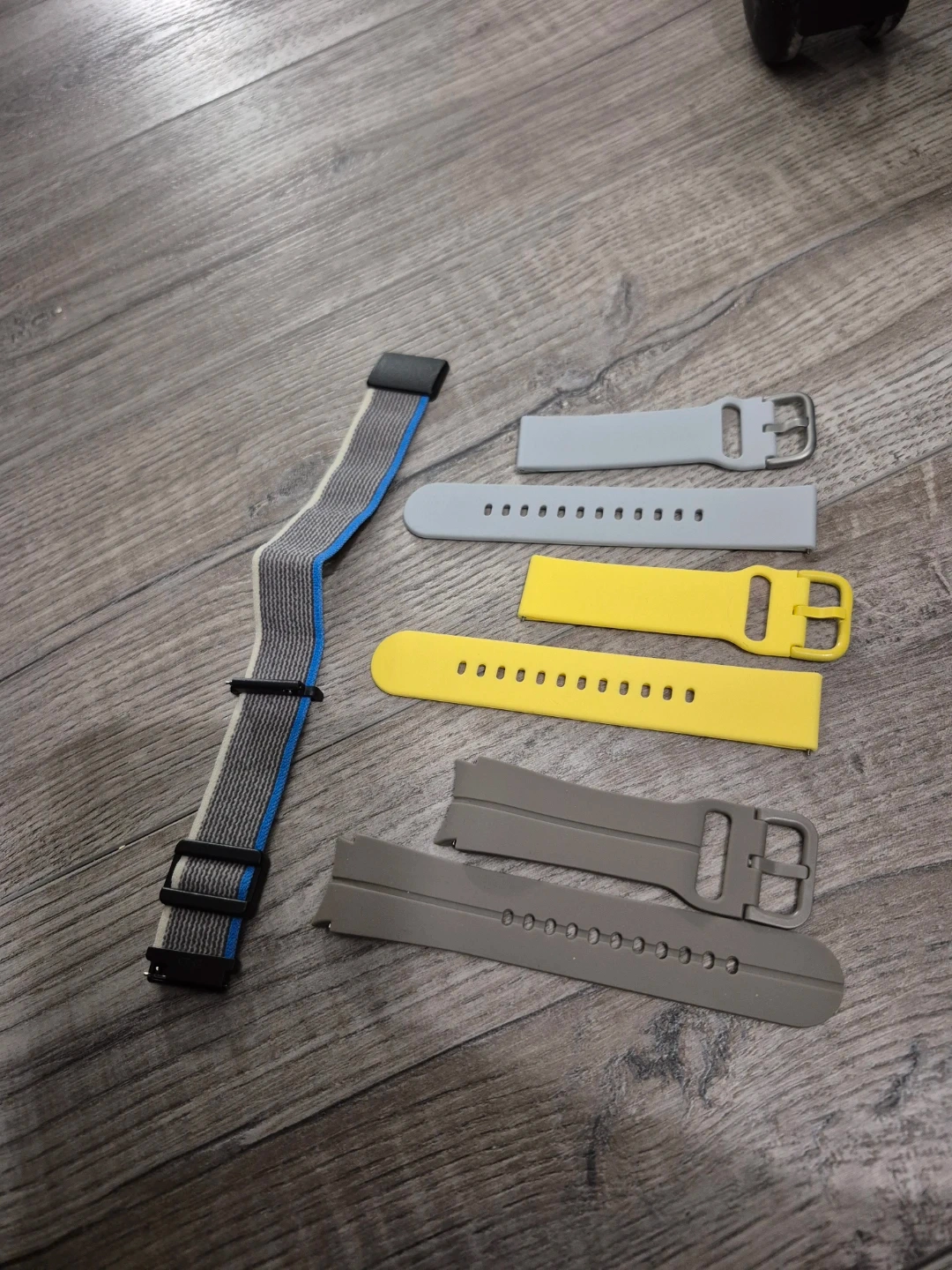 Set of five smartwatch bands in grey, yellow, and a fabric grey/blue/black stripe design. Includes buckle closures and adjustable hole-punch styles. Suitable for various smartwatch models.