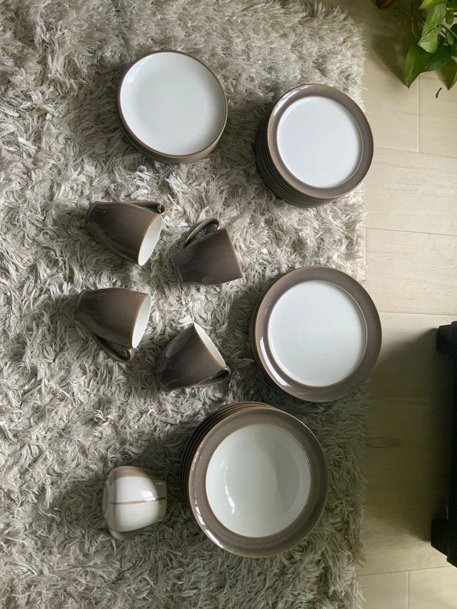 Selling the following from the denby truffle line: - 5 rimmed soup bowls - 9” - $20 each - 4 salad desert plates - 9 3/4’ - $15 each - 8 bread and butter wide band plates -8” - $15 each - 7 bread and butter -7” - $20 each - 4 mugs solid colour - $15 each - 1 truffle patter mug - $20 All plates in excellent condition, no chips or cracks. Pick up in Etobicoke.