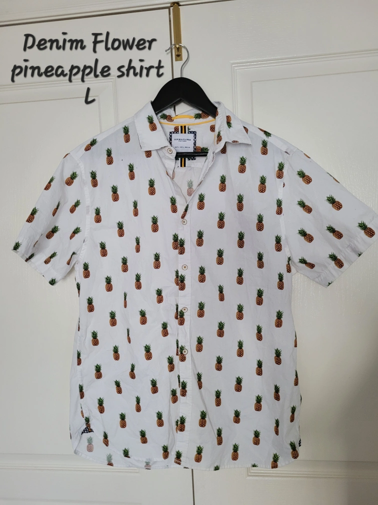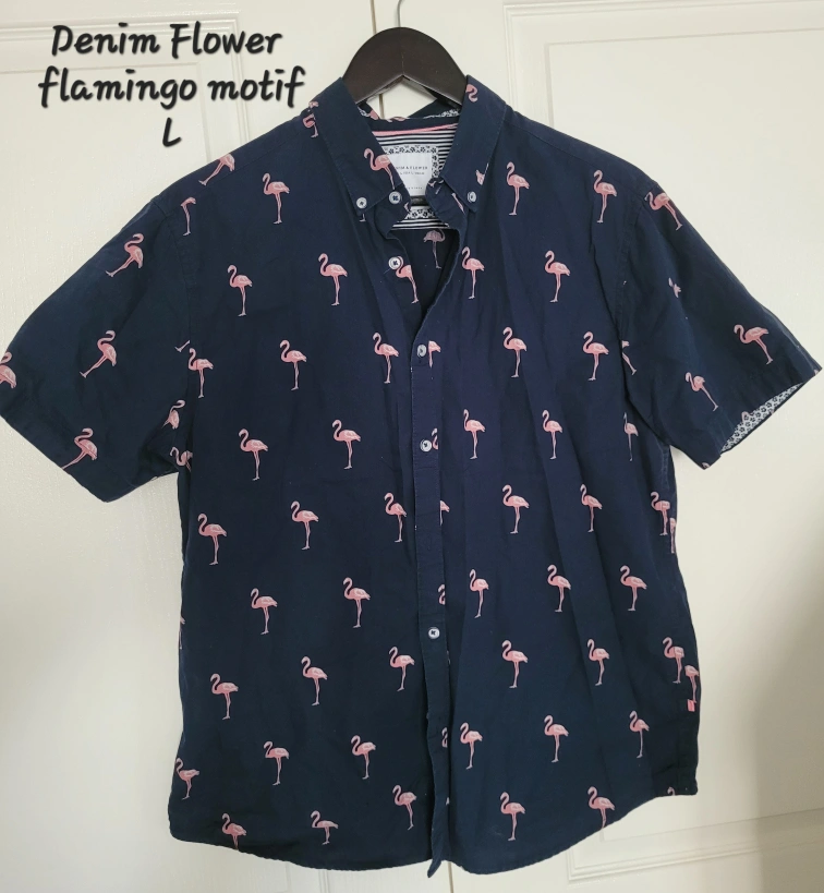 Selling a few gently-used half-sleeve shirts: - Denim Flower pineapple shirt, size L - Denim Flower flamingo shirt, size L - Denim Flower flower motif shirt, size L - GAP red dot motif shirt, size M $10 each