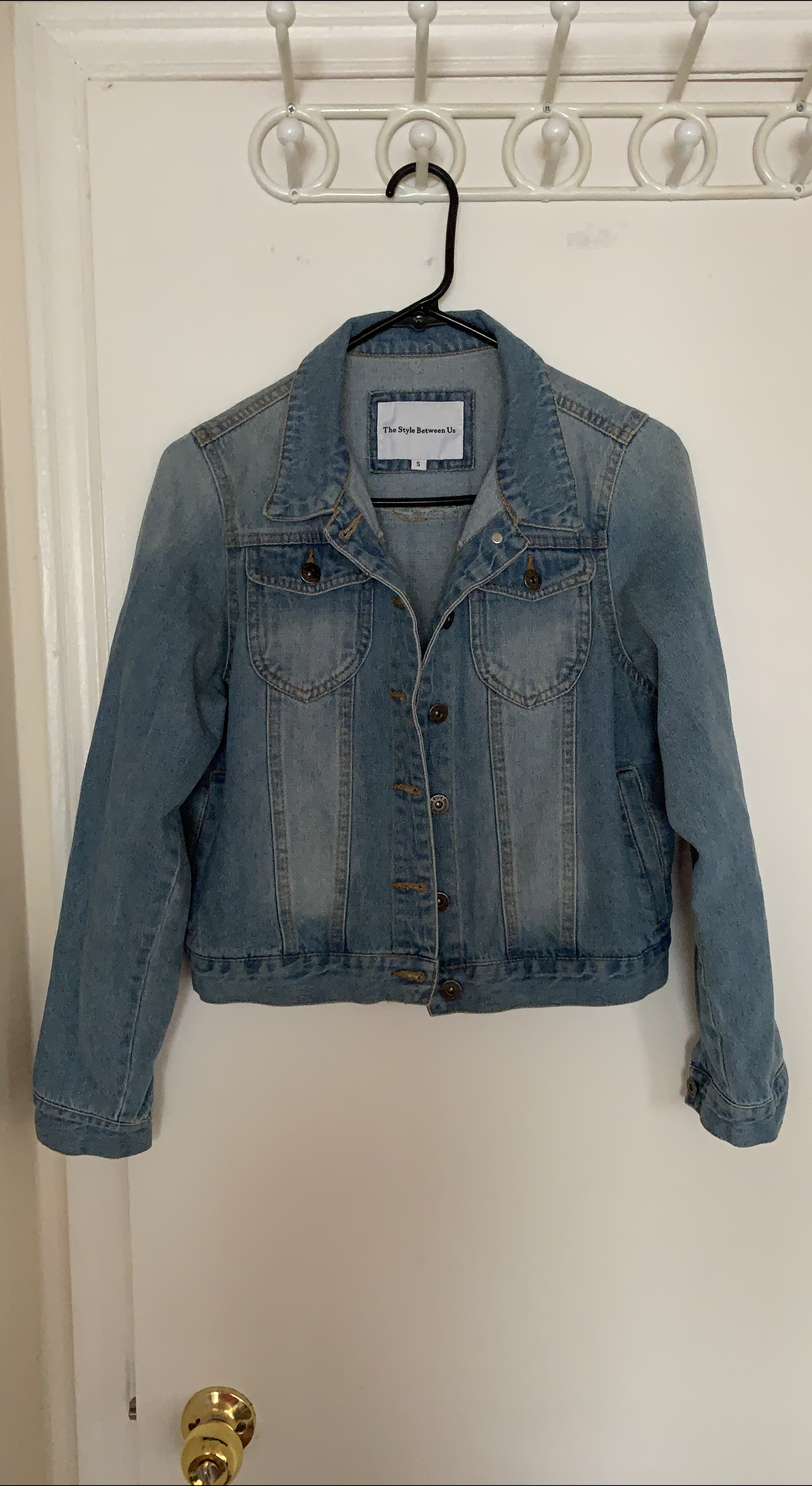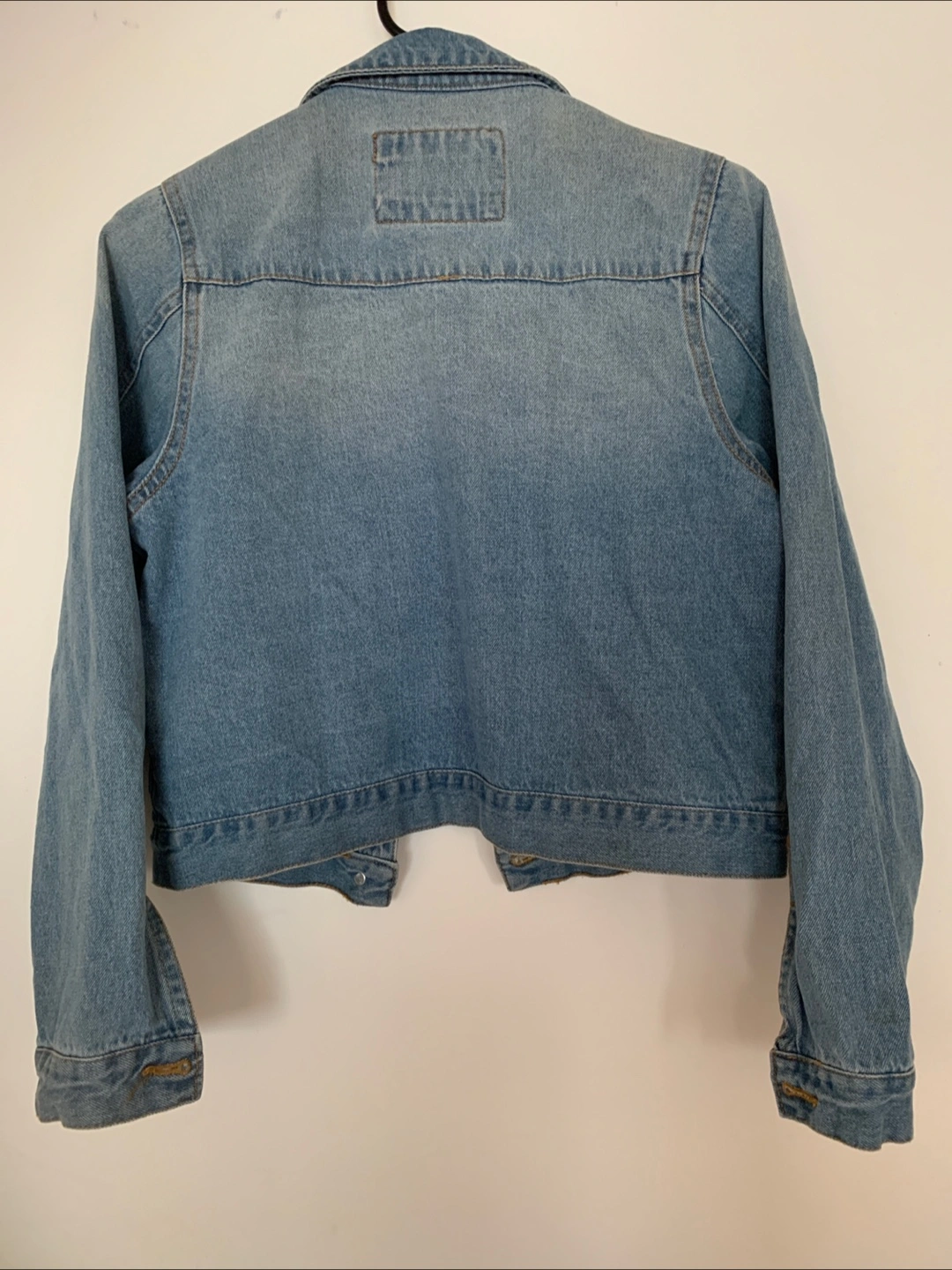 Denim jacket ends right above the hip. Perfect for layering or wearing on its own. Very loved and in perfect condition, just a bit small for me.