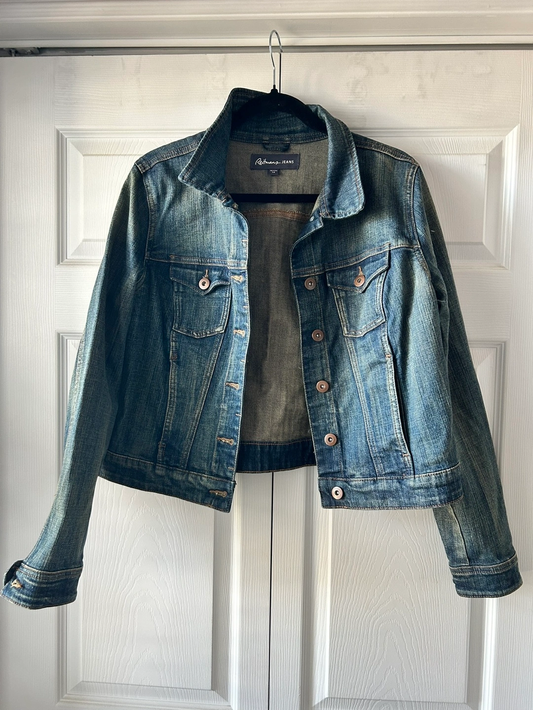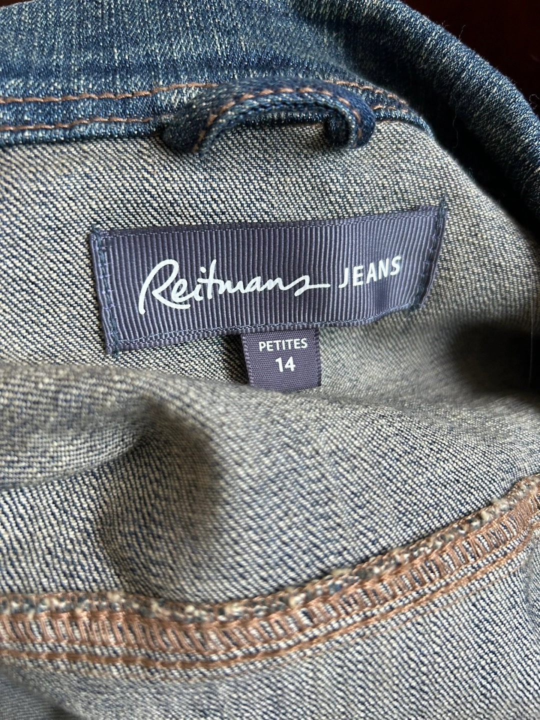 Women's blue denim jacket. Size 14. Button closure. Long sleeves. Faded wash. Pockets.