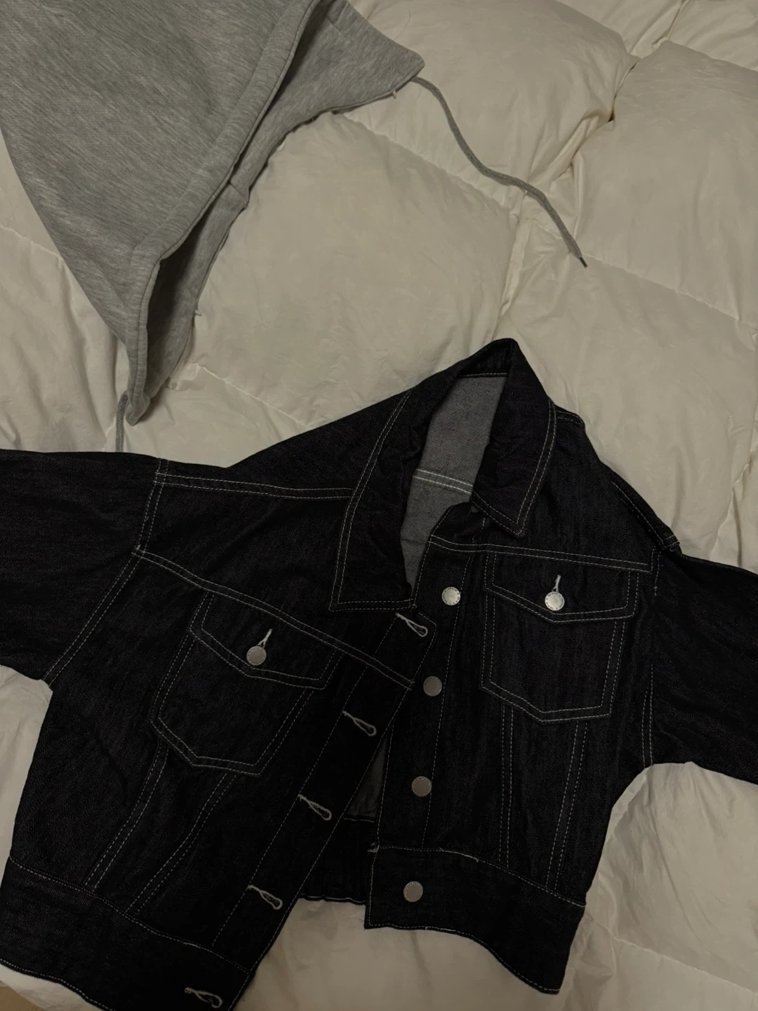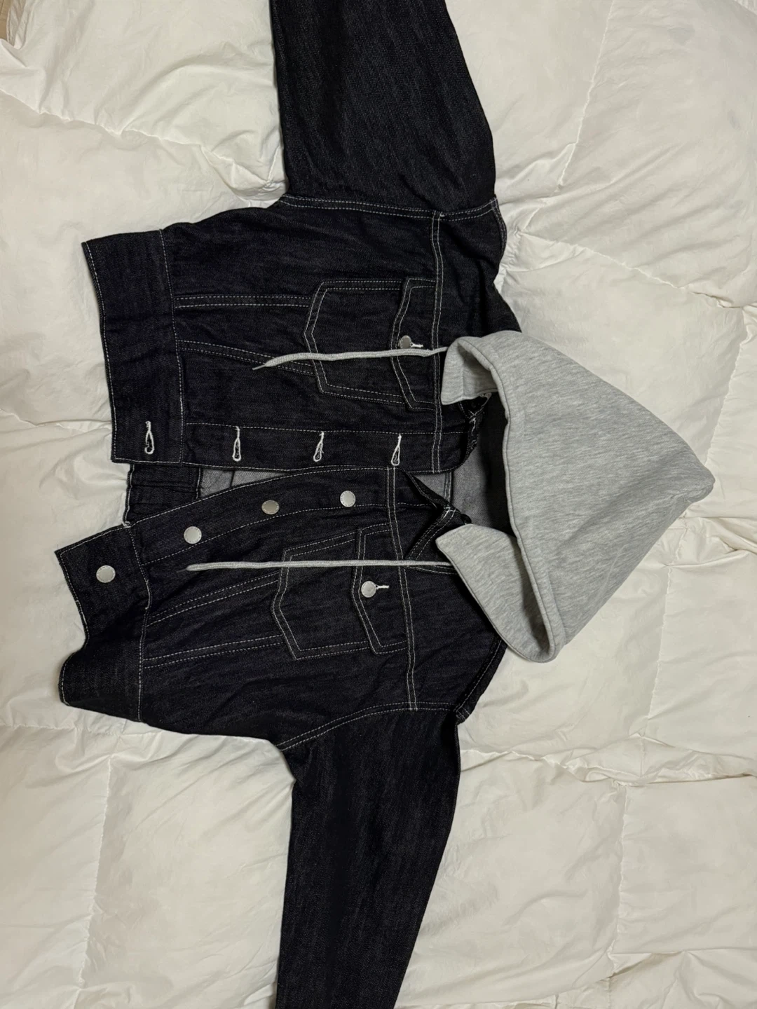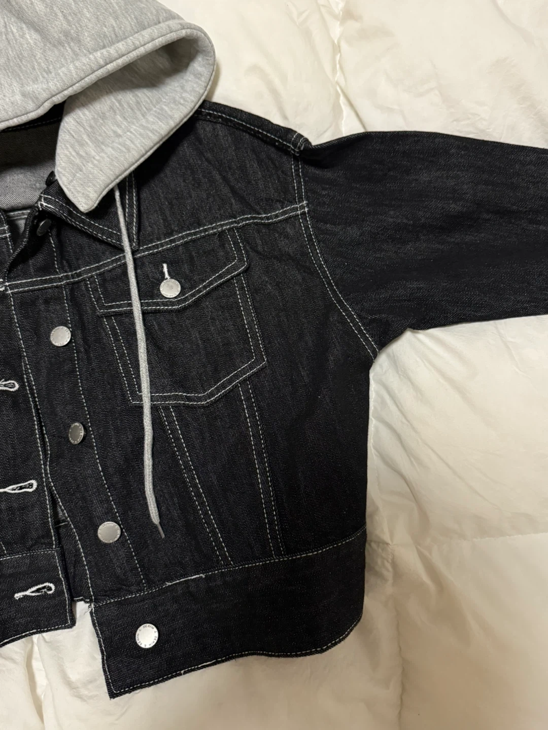 10Here's a stylish denim jacket with a grey hoodie attached! It's in great condition and ready for a new home. The denim is a dark wash, and the hoodie adds a nice casual touch. Perfect for layering or wearing on its own. This is totally a new product that I haven’t worn before!