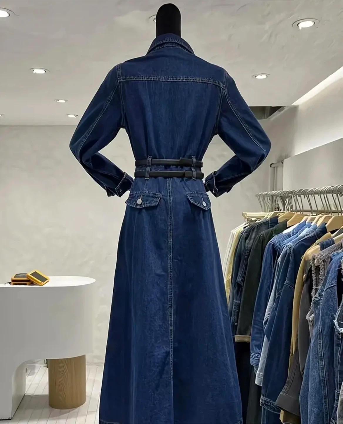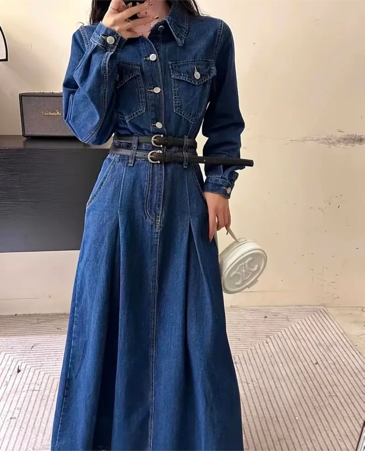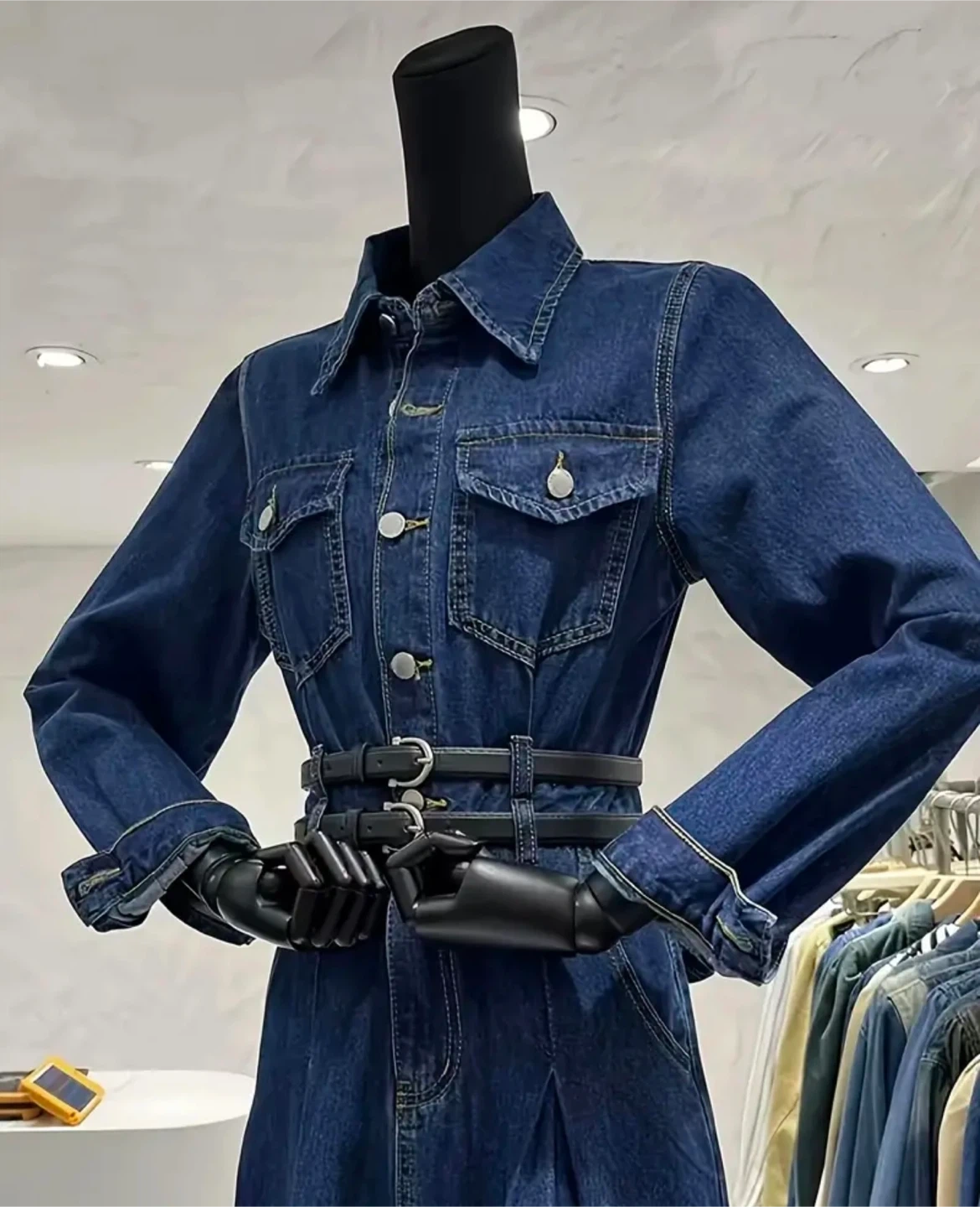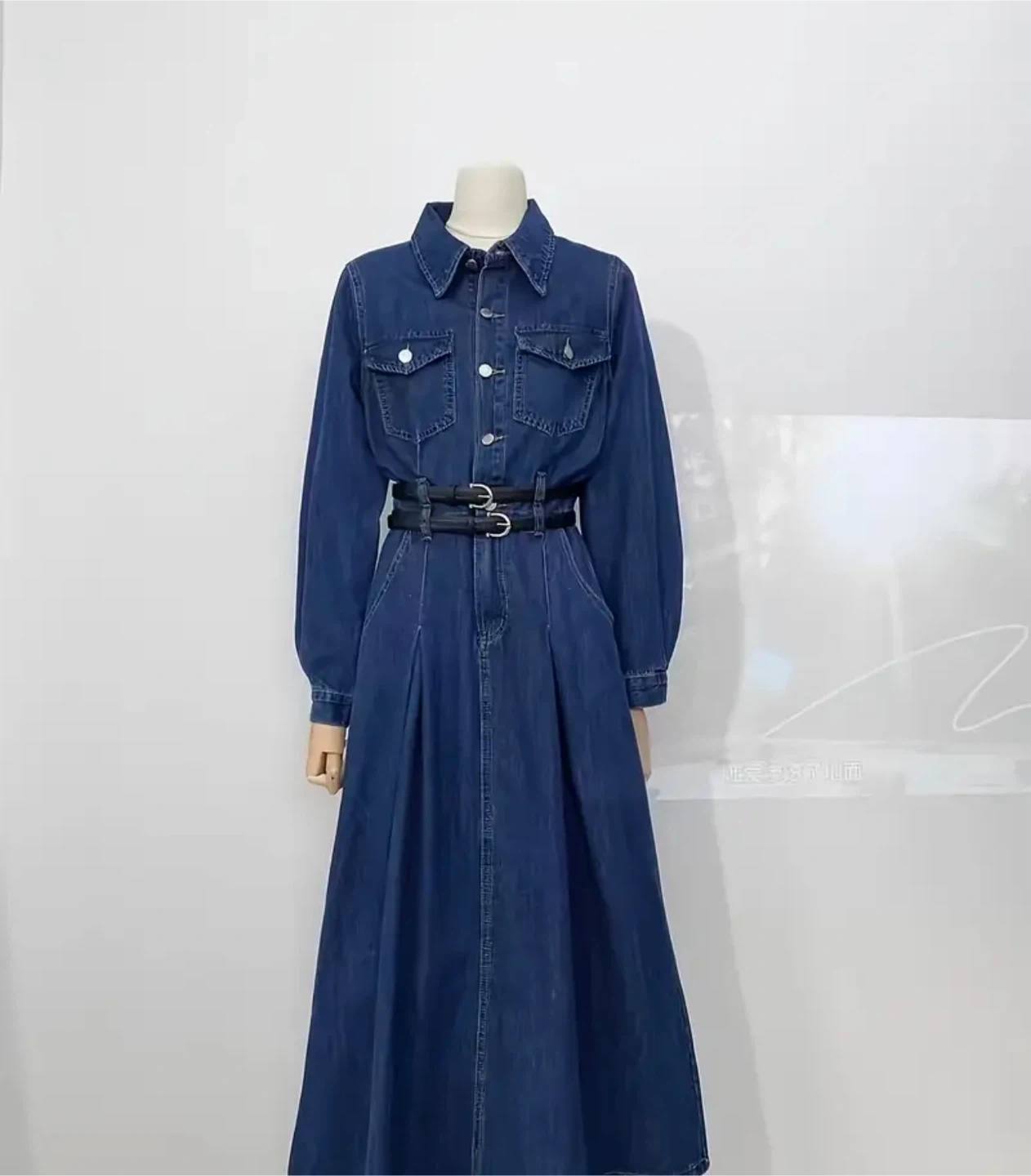 55A stylish denim shirt dress, perfect for any occasion! It features a classic collar, button-down front, and long sleeves. The dress comes with a belt to cinch the waist and accentuate your figure. Made from comfortable denim material, it's a versatile piece that can be dressed up or down