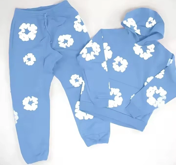 10Denim Tears comfy-looking matching hoodie and sweatpants set! It's a light blue colour with a fun white floral pattern. Perfect for lounging around the house or running errands.