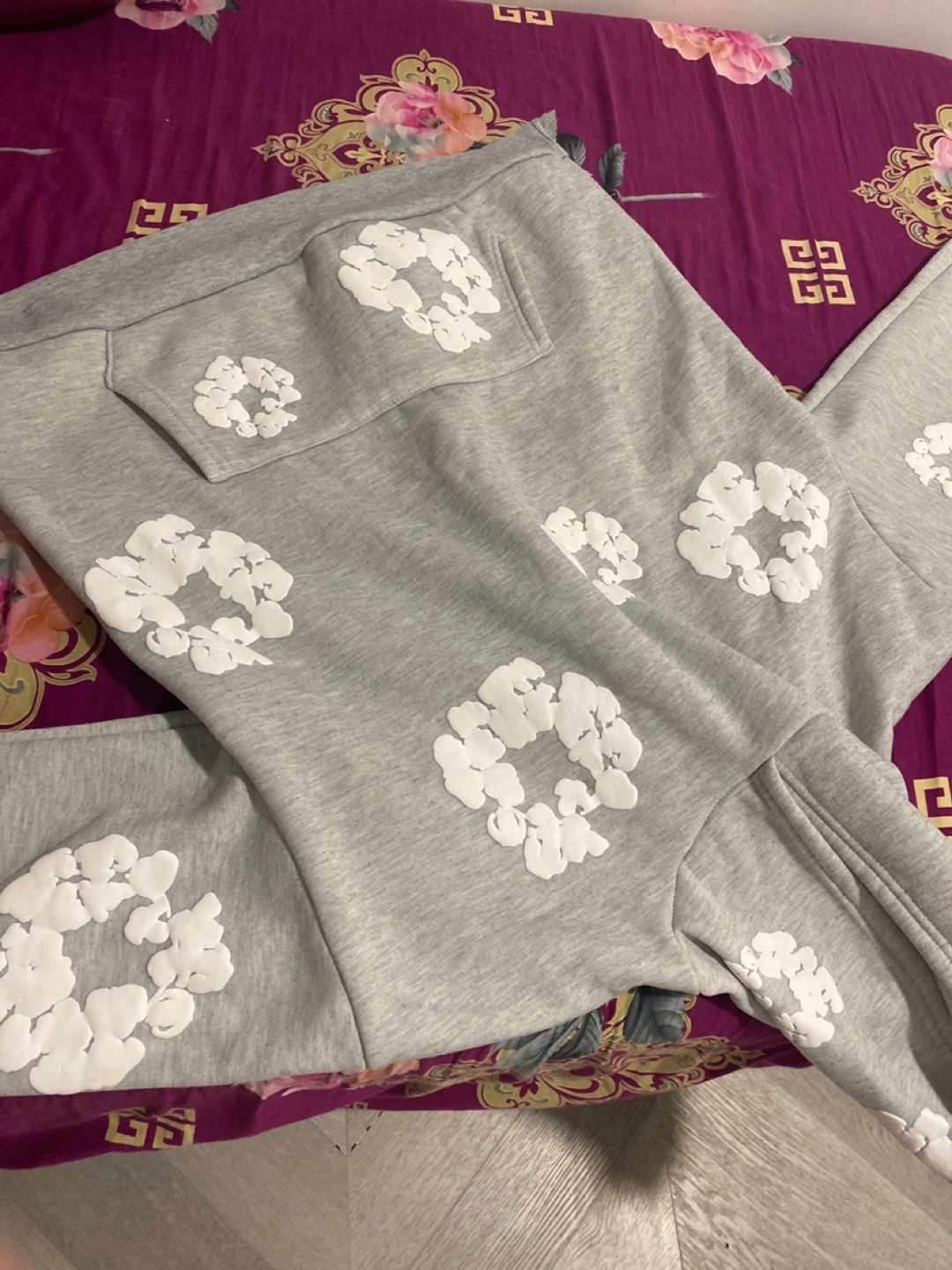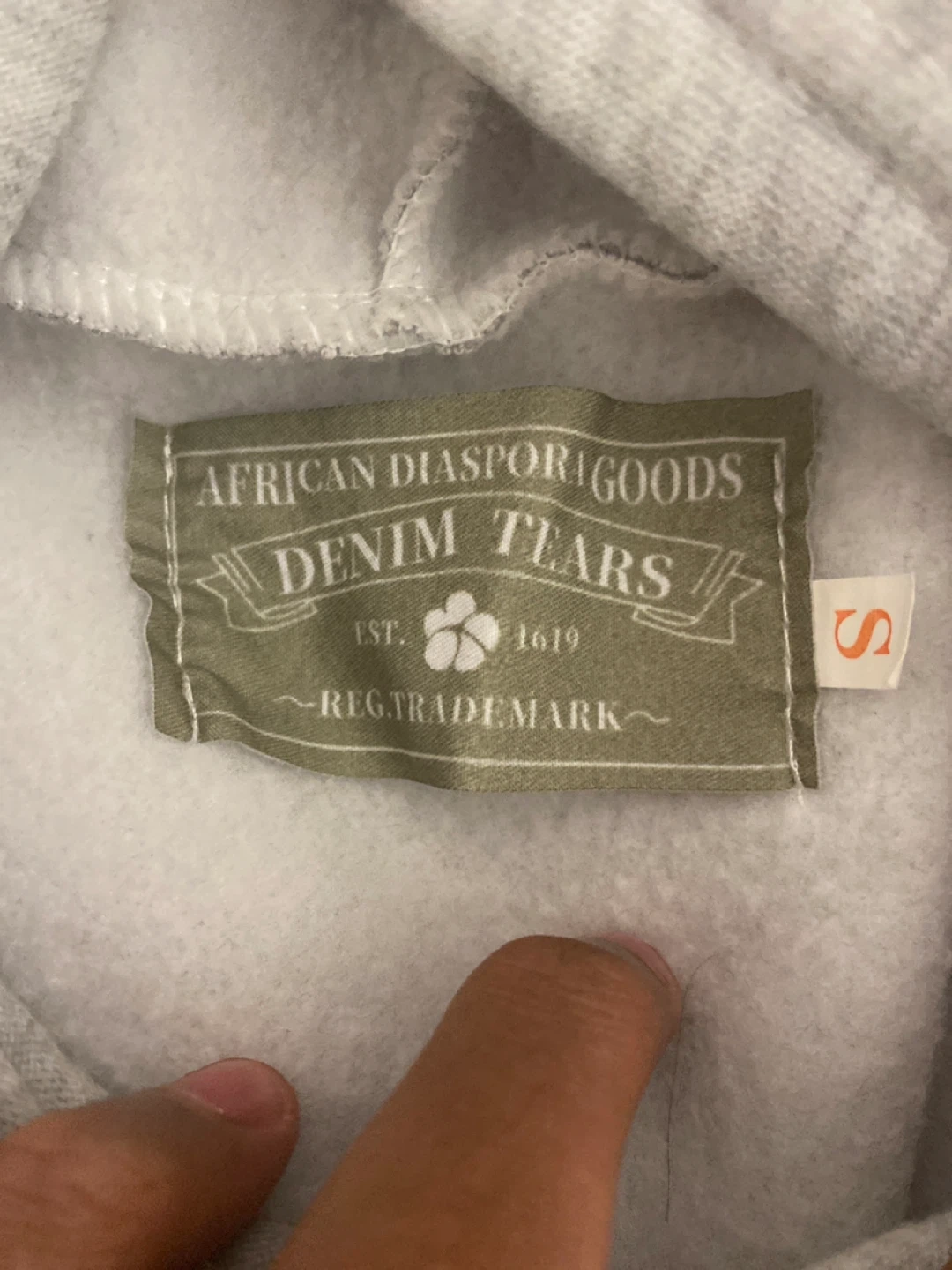 Selling a Denim Tears hoodie in size small. It's a light grey colour with white floral designs. The hoodie is in great condition and ready for a new home!