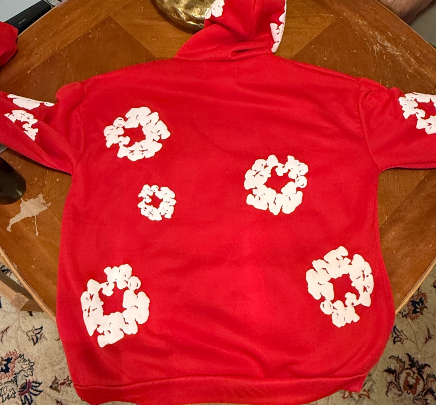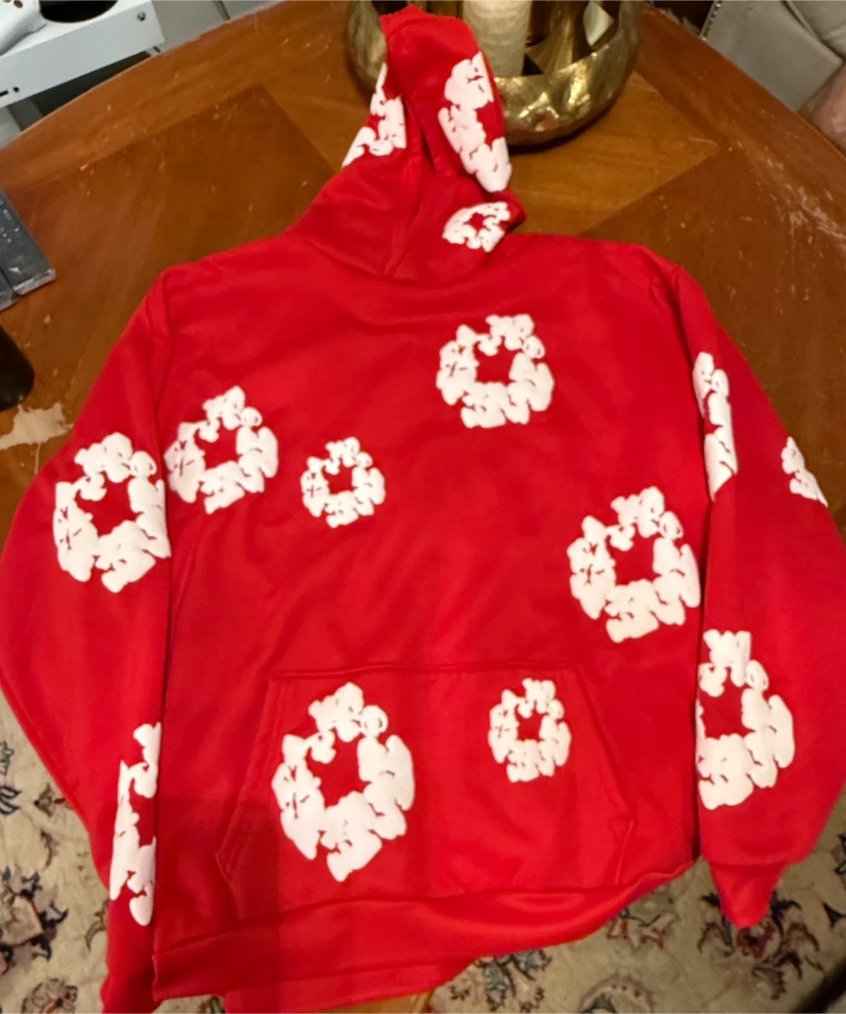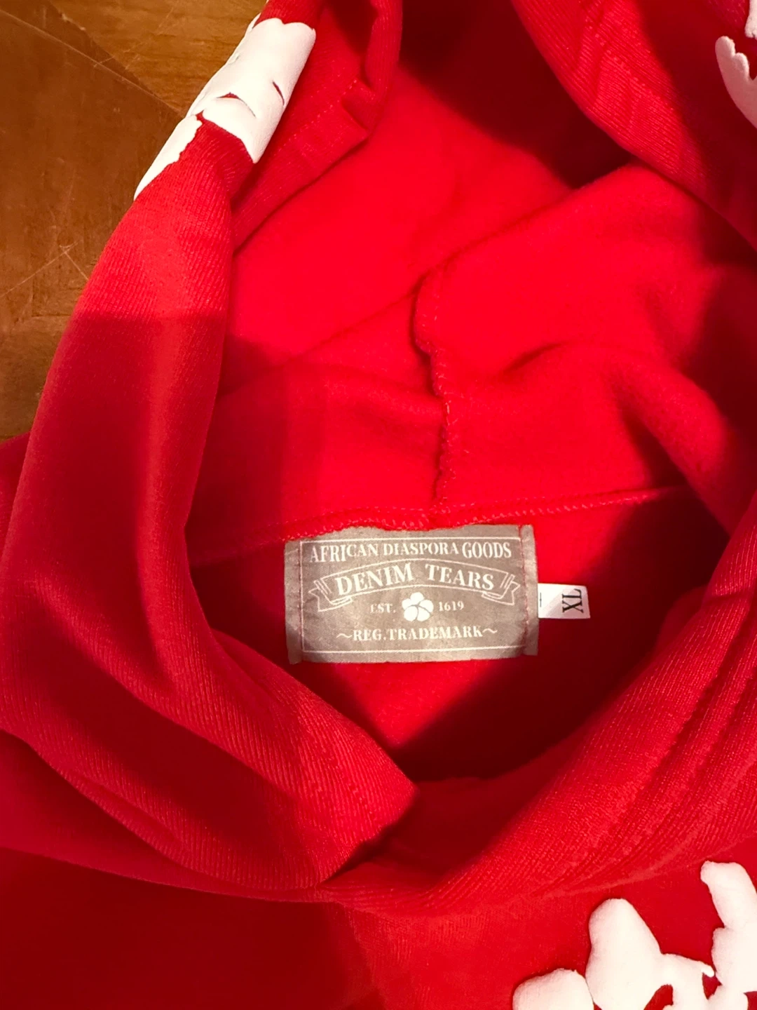 60Selling a bright red Denim Tears hoodie in size XL. It features a unique floral design in white. The hoodie is in great condition and ready for a new home!