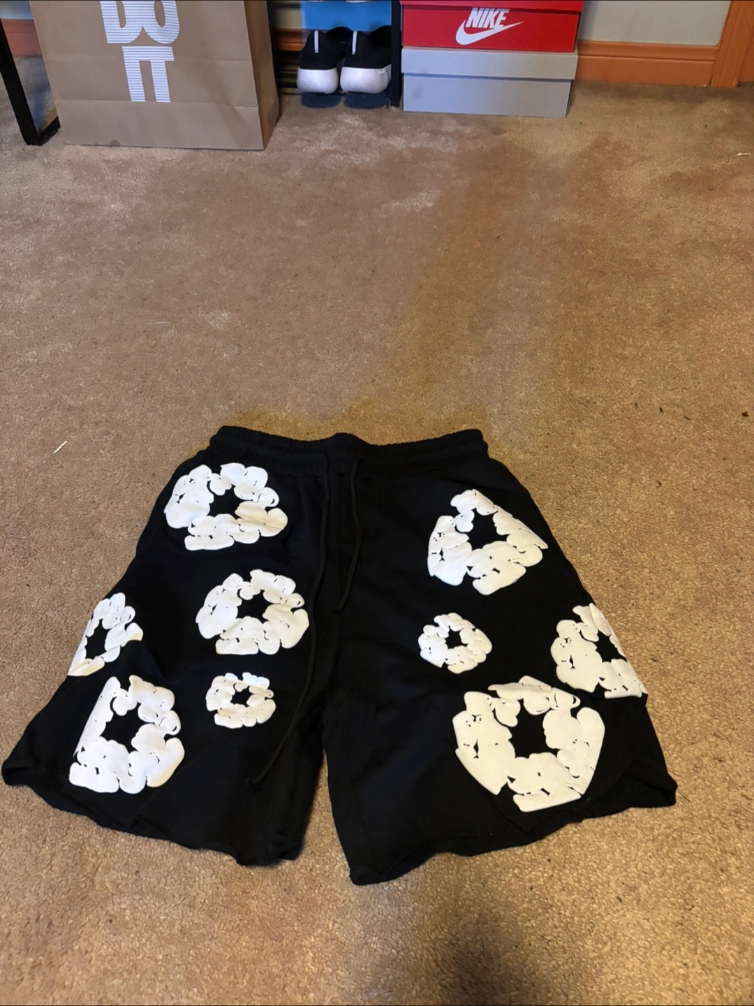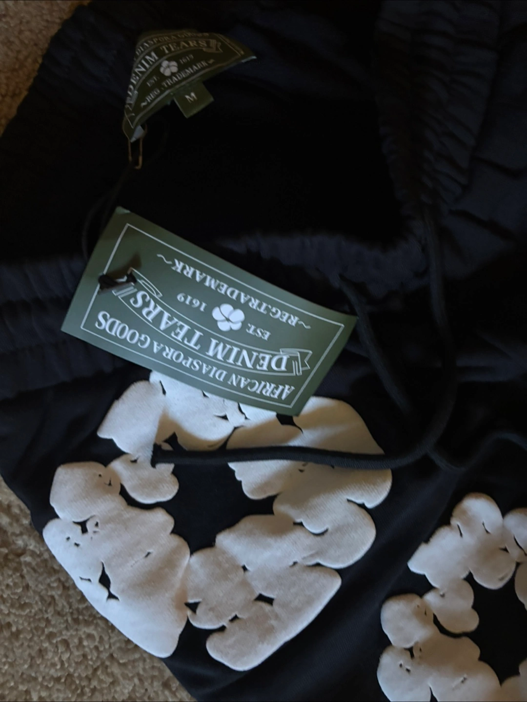 10Selling a pair of Denim Tears African Diaspora Goods shorts in size medium! They're black with a unique white floral pattern. Great for casual wear or streetwear.
