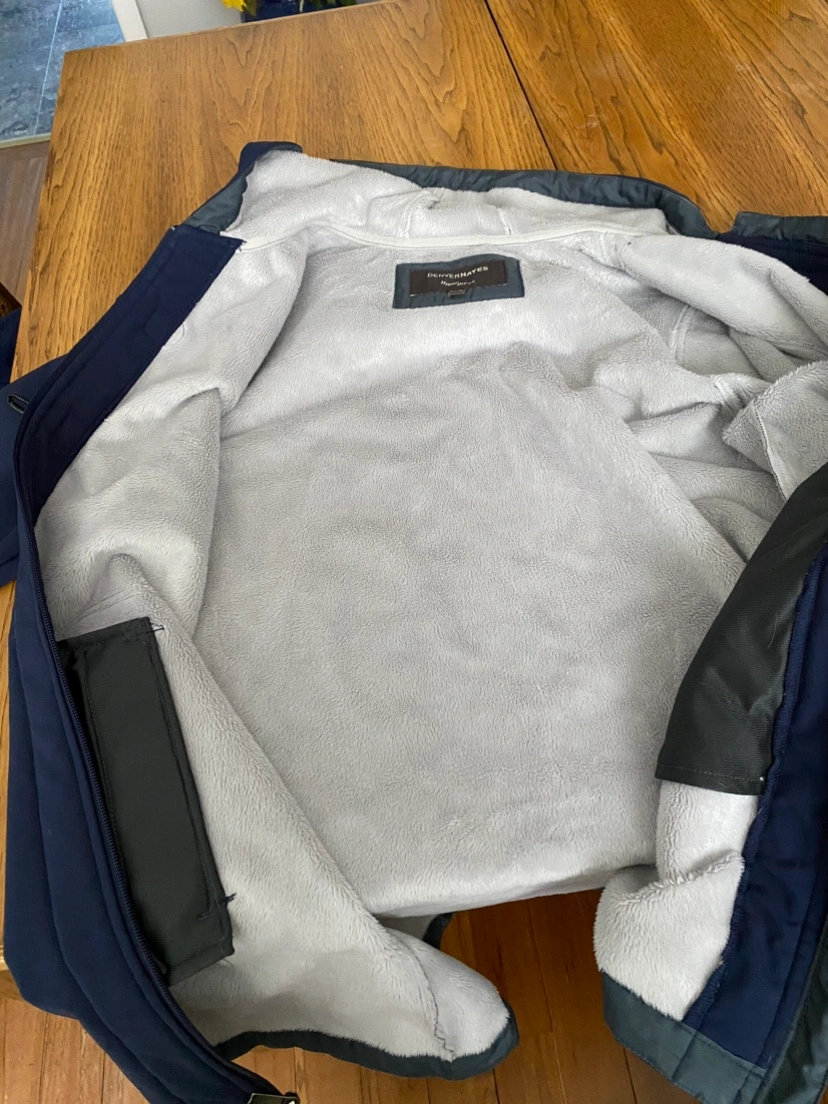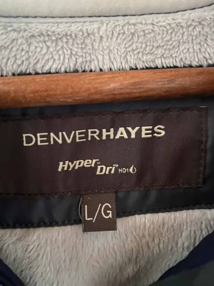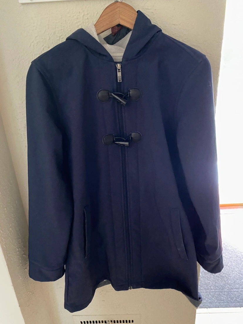 Women’s navy blue jacket with a fleece lining, zipper closure. Size L/G. Has a hood.