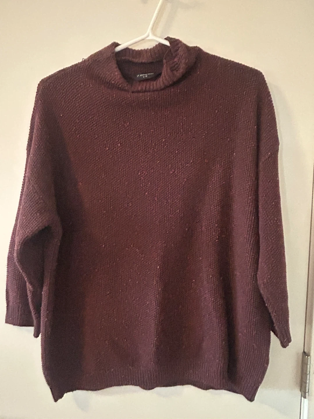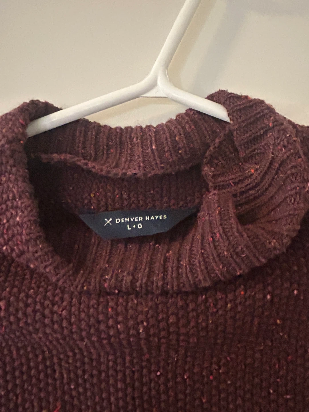 Cozy Denver Hayes sweater in a lovely burgundy colour! It's a size large and has a comfortable, relaxed fit. Perfect for staying warm on chilly days