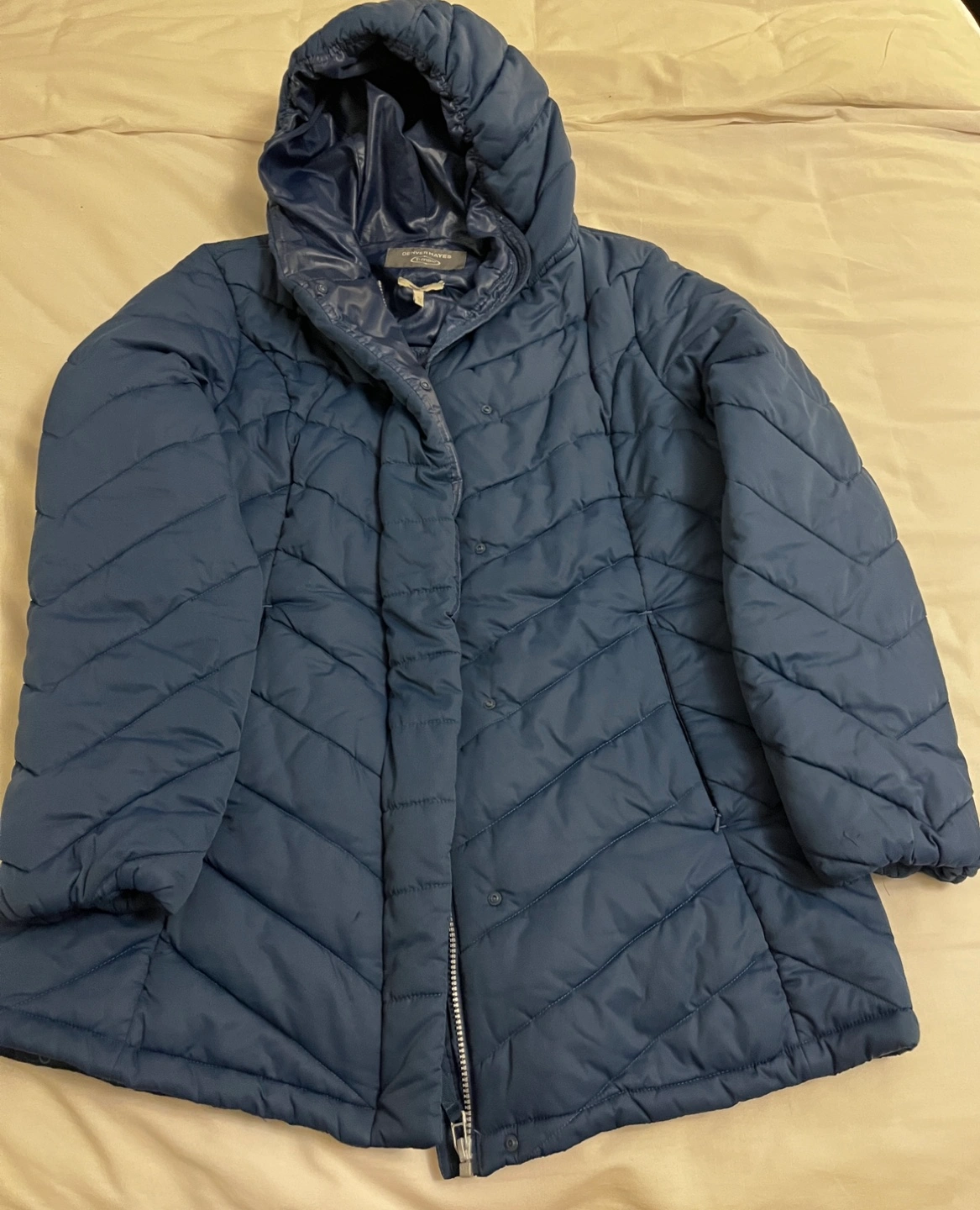 310Women's navy blue puffer jacket. Size XL/16 but fits to size S and M. Features a hood and zipper closure. Quilted design. Excellent condition. No damages or lint Comes from a pet and smoke free home Cash only