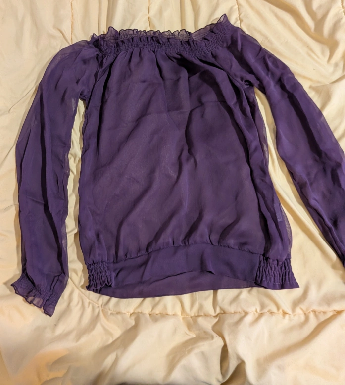 Selling a cute purple sheer blouse from Deo Femme. It's a size medium and in great condition! Perfect for a night out or a casual day.