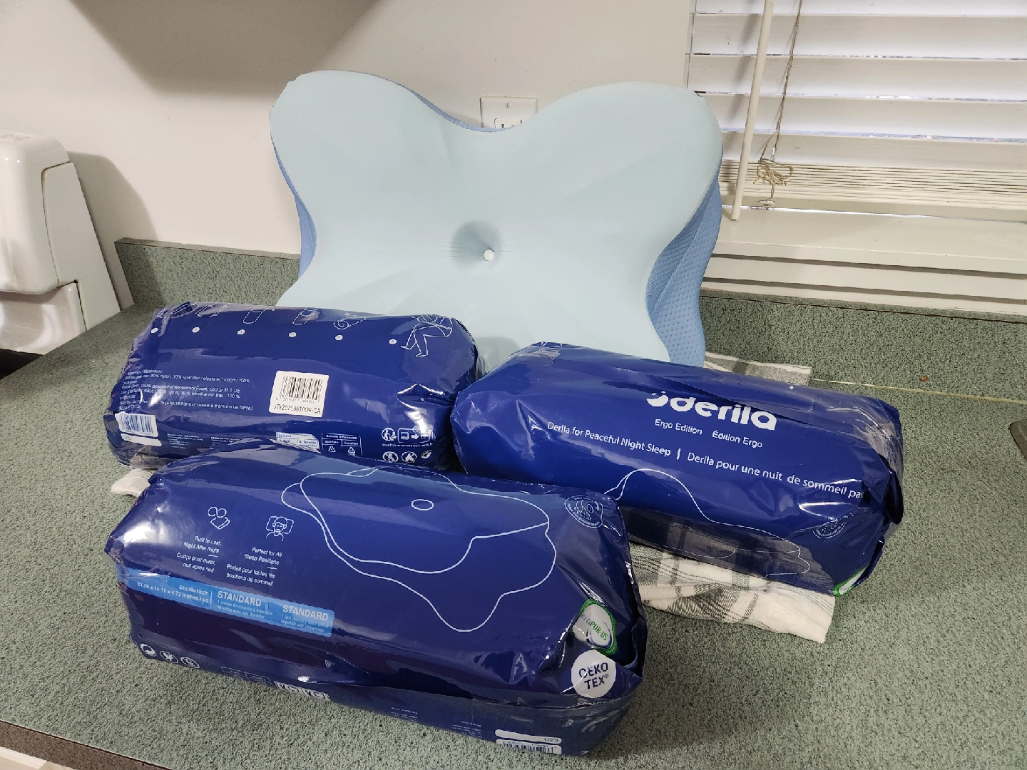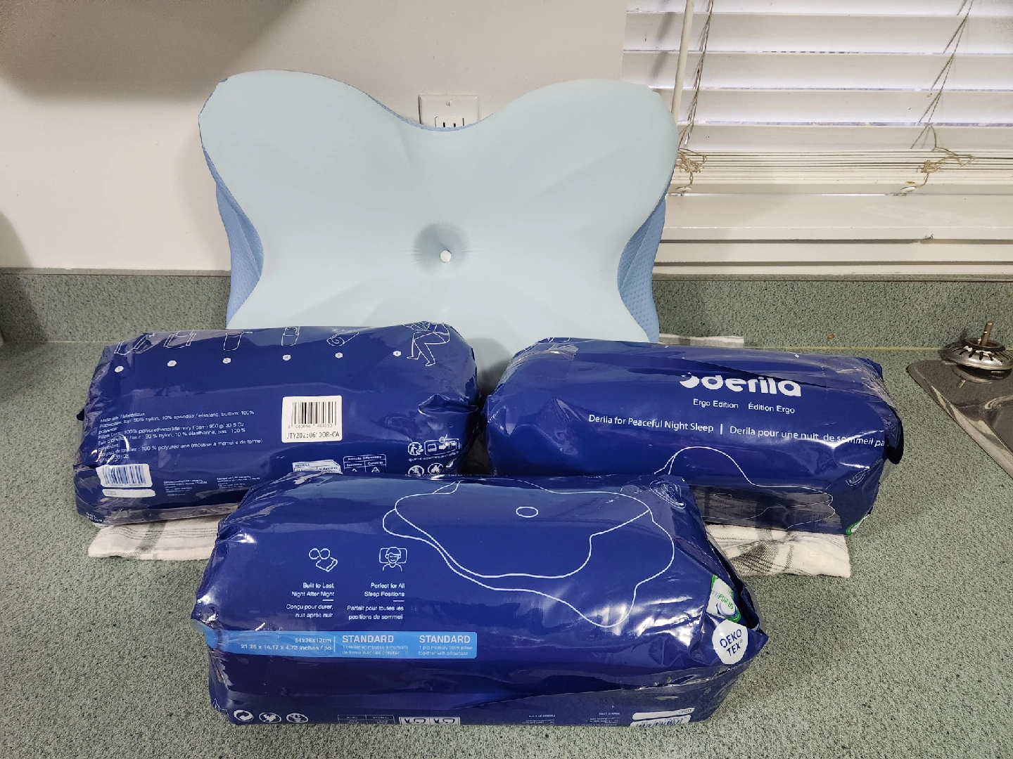 https://derila-ergo.com/ 4 pillows. BRAND NEW - received 4 days ago. tried one with a thick pillow case to keep it new for 3 nights. these are excellent. I need something totally flat but thought these might work. See web link above for all details. I've paid shipping to receive them. I'm posting to see if there's a buyer first before paying return shipping.
