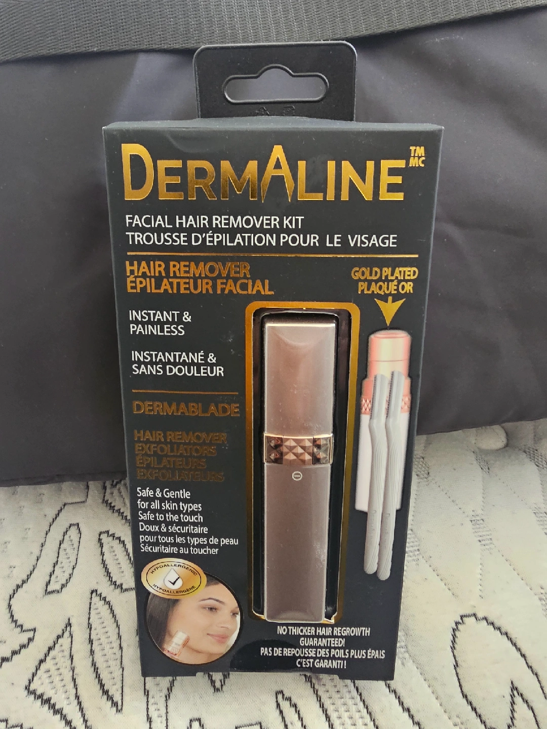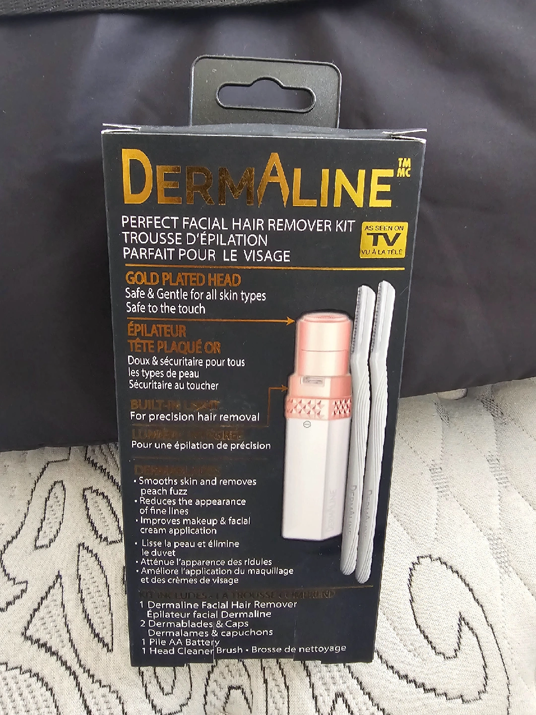 913BNIB Gold plated head Built-in light Instant and painless Safe and gentle for all skin types Safe to the touch NO thicker hair regrowth guaranteed! Smooths skin and removes peach fuzz Reduces appearance of fine lines Improves make-up and facial cream application Hypoallergenic Includes: 1 Dermaline Facial Hair Remover 2 Dermablades and Caps 1 Pile AA Battery 1 Head Cleaner Brush AS SEEN ON TV FINAL SALE Accepting cash only please