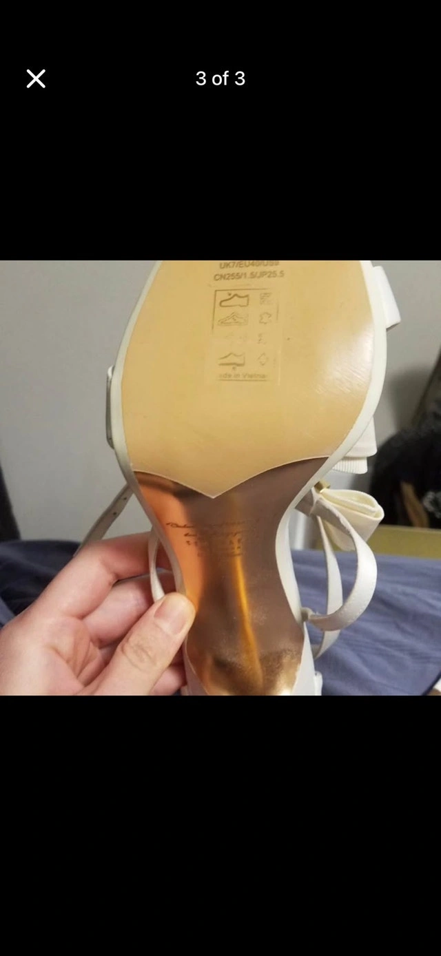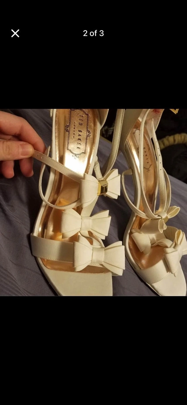 These are Ted Baker Heels, size 10. The heels are white with triple bow detailing. They're in good condition and ready for a night out! Size: 10 Colour: White Brand: Ted Baker These gorgeous heels are waiting for you to give them a whirl around town. If the ad's still up, you bet they're available! Cash accepted.