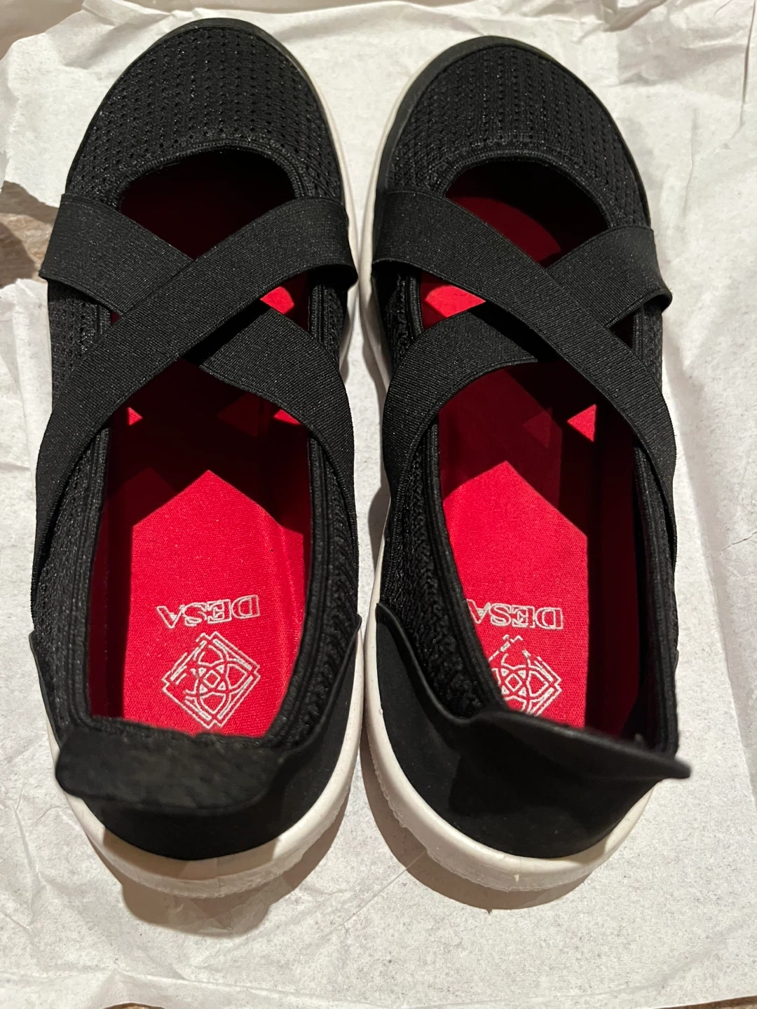 10Selling a pair of DESA Mary Jane style shoes in black. They feature a comfortable design with criss-cross elastic straps. Size 38.