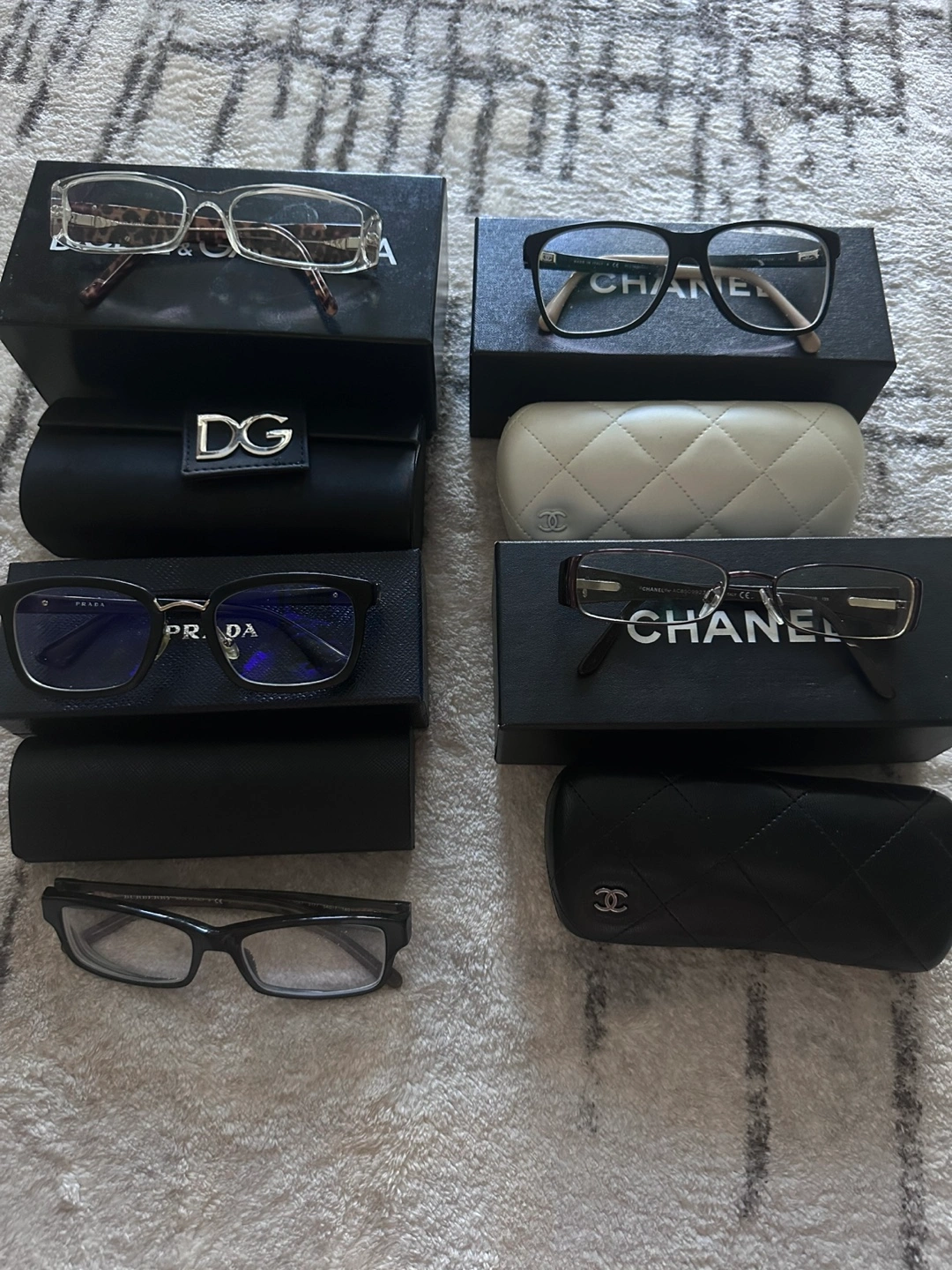10Various styles of eyeglasses. Some pairs feature bold frames. Many come with cases. Enjoy a moment of reflection with these stylish glasses. Chanel black one and parade was sold Second-Hand Authentic Eyeglass Frame All frames are genuine and lightly used. I had laser eye surgery recently and no longer need them, so I’m selling them. • $50 each for branded frames • $10 for the unbranded one • All in good condition Cash only, pick-up in Richmond Hill or Markham