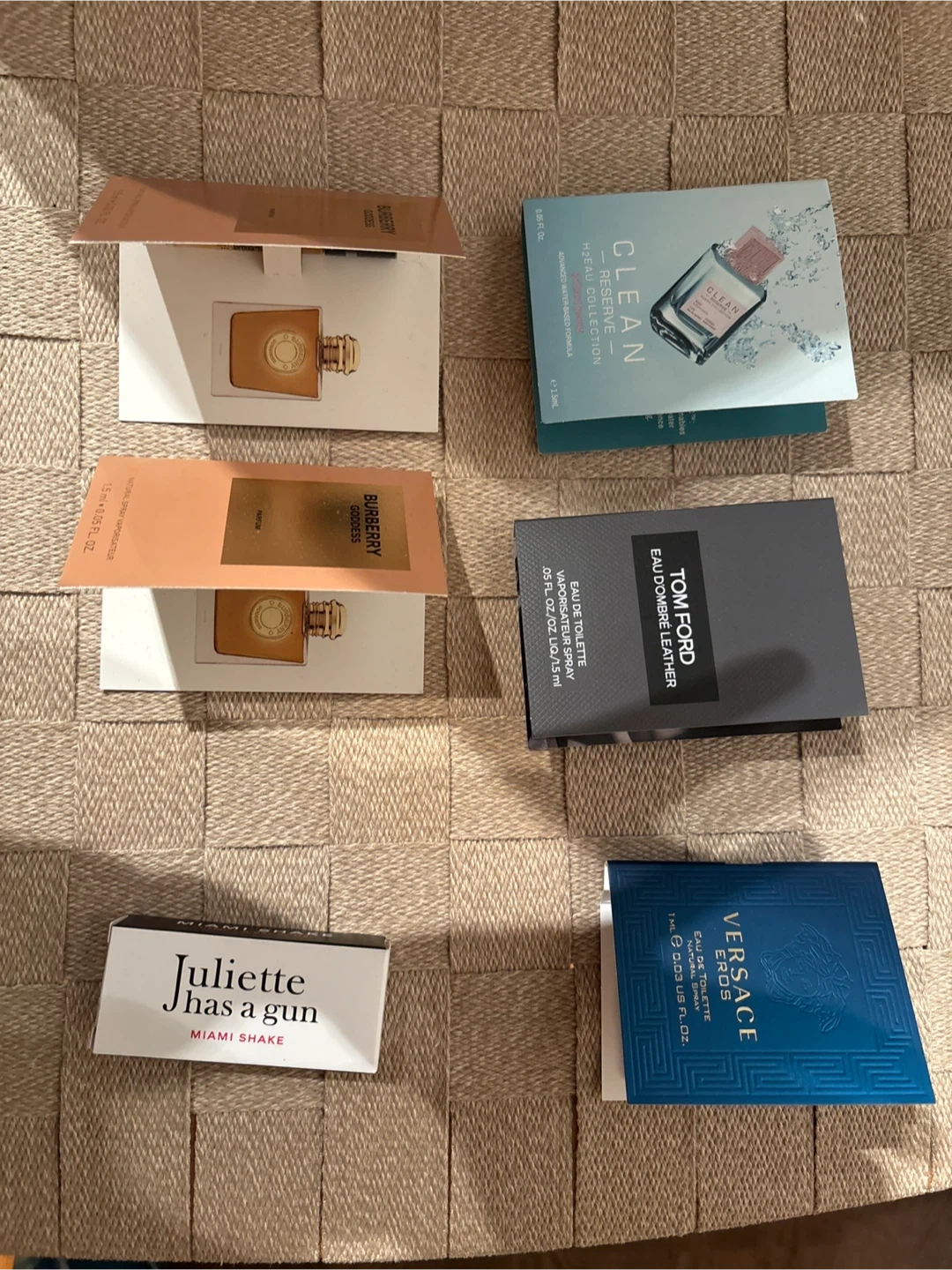 132Selling a collection of perfume samples! This lot includes: - 2 Burberry Goddess Parfum (1.5 ml / 0.05 fl oz) - Clean Reserve H2Eau Collection (1.5 ml / 0.05 fl oz) - Tom Ford Ombre Leather Eau de Toilette (1.5 ml / 0.05 fl oz) - Versace Eros Eau de Toilette (1 ml / 0.03 US fl oz) - Juliette Has a Gun Miami Shake Perfect for trying out new scents!