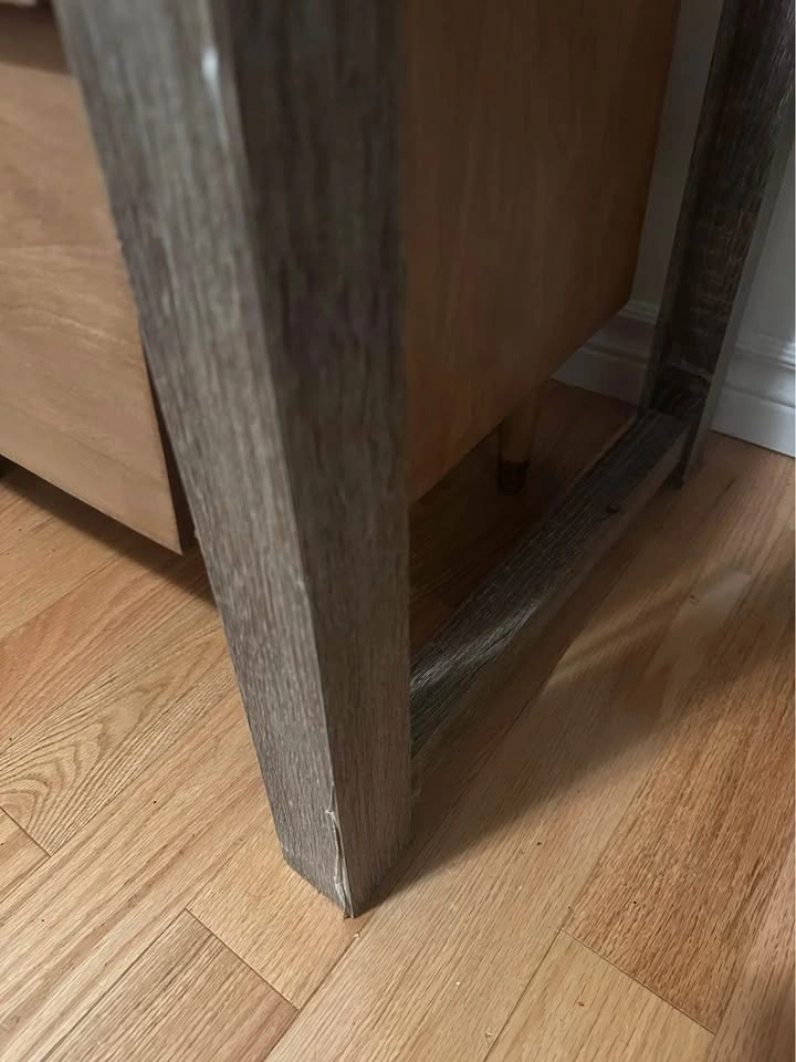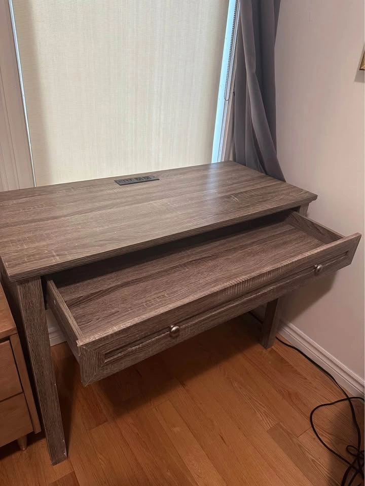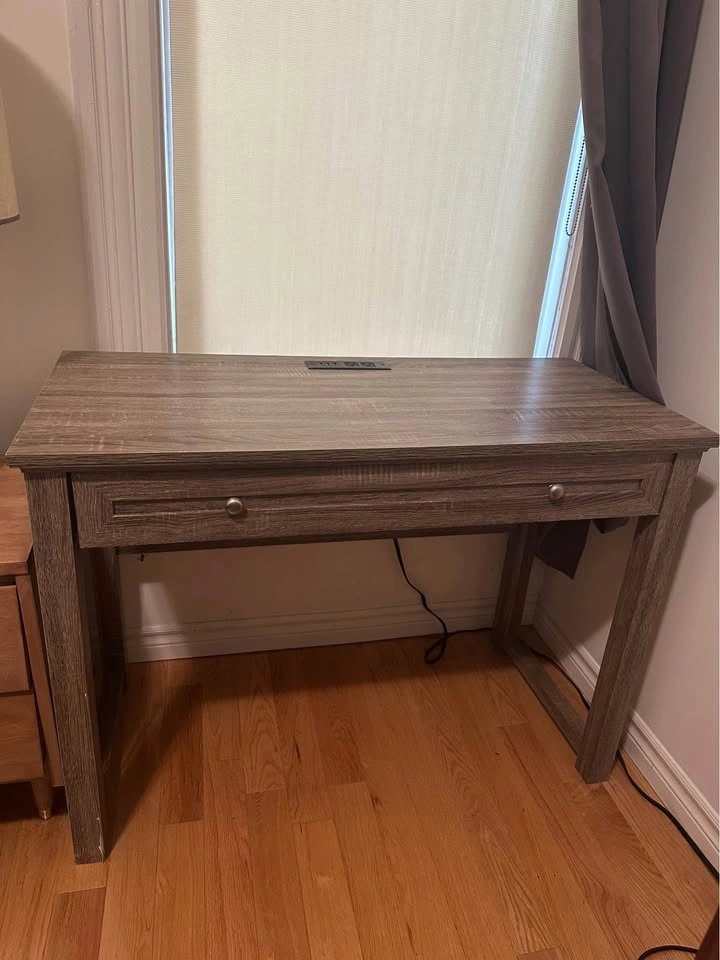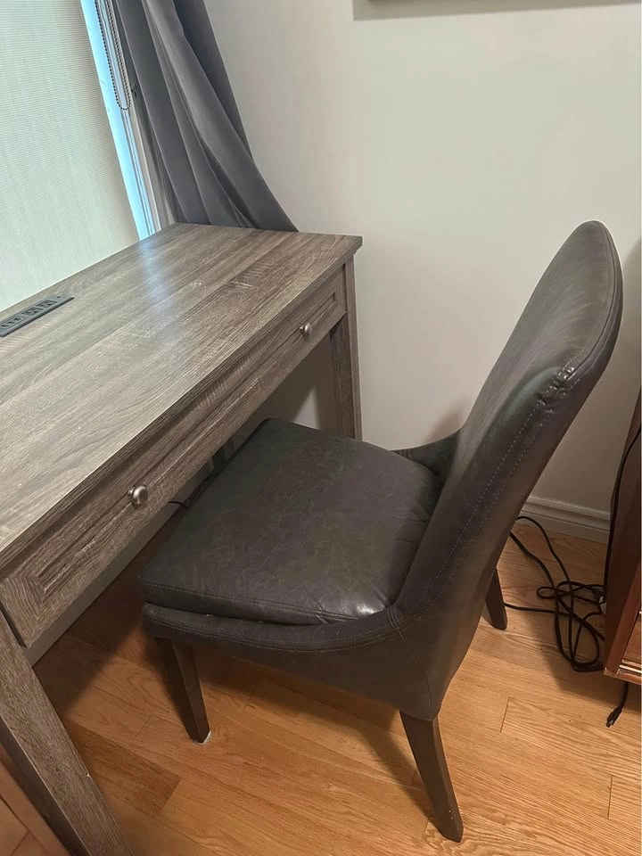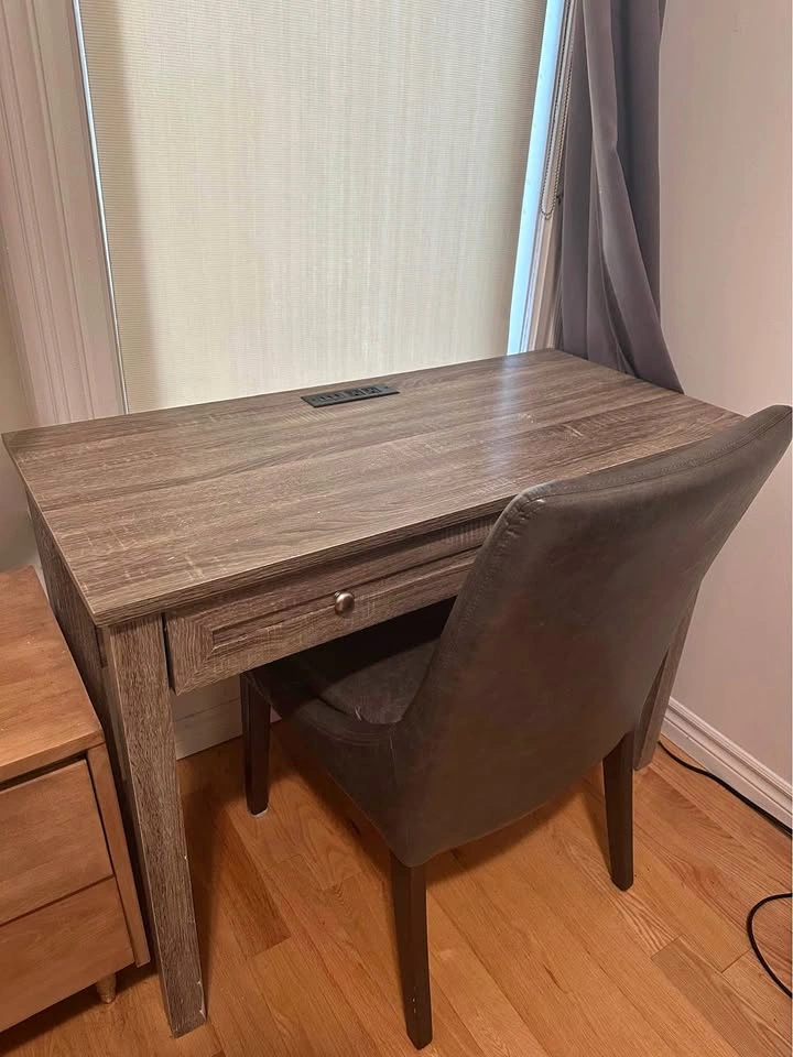 102Desk: built in plugs (3x USB, 2x wall AC) and large drawer. Left leg is slightly damaged and wobbly, but the desk is still sturdy when not being moved. 42 in wide, 19.5 in deep, 31.5 in tall. Chair: technically a dining chair but it is comfy and goes well with the desk. 17 in wide, 20 in deep, 37 in tall.