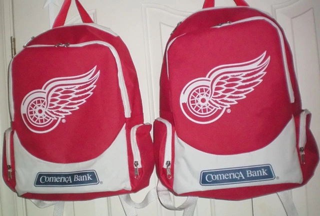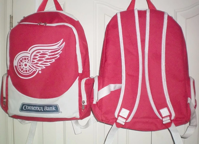 Detroit Red Wings NHL Backpack Comerica Park SGA - Comerica Park Stadium giveaway SGA 10/25/19 - 14"W x 16"H x 5"D - Canvas water resistant with large screenprinted Red Wings logo on front and Comerica Park sponsor logo - Adjustable shoulder straps and 1 carry strap - Lightweight Red and White. - 3 zippered pockets - 1 on top and 2 on sides plus zippered main opening - Pre-owned in excellent condition. - Price $20 each (Only one left now)