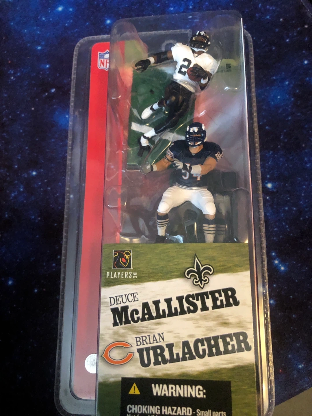 Selling a set of NFL figures featuring Deuce McAllister and Brian Urlacher. These figures are still in their original packaging, making them a great addition to any sports memorabilia collection!
