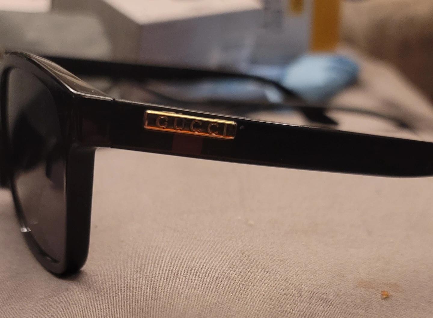 Black Gucci sunglasses with gold emblem detail. These shades offer stylish eye protection. They're suitable for sunny days and casual wear.