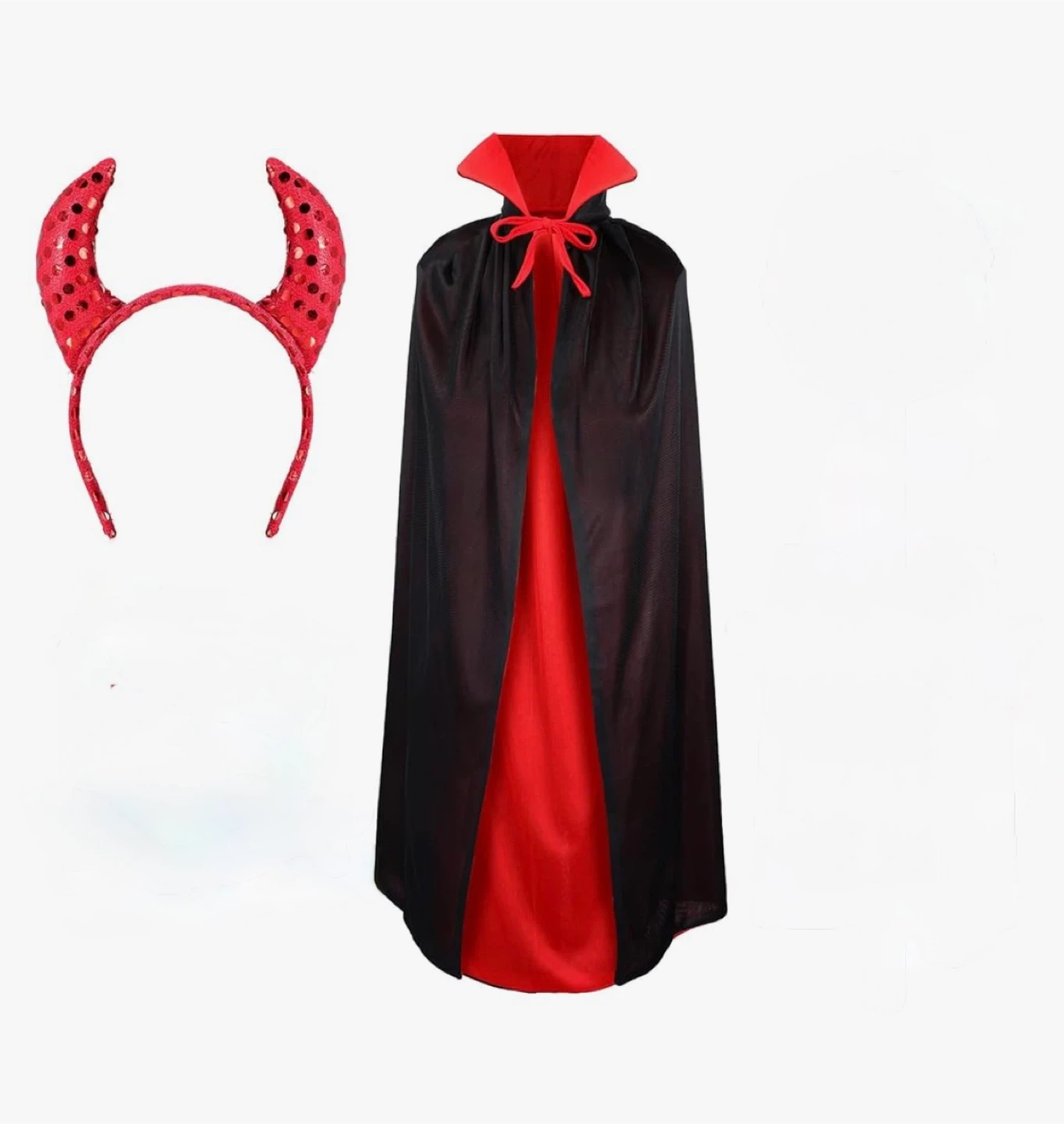 Get ready for Halloween with this double-face cloak! It's red on one side and black on the other, so you can switch up your look. The cloak is 35 inches long, perfect for adding some spooky flair to your costume. Comes with a headband with horns . New Meet up & cash only pls Meet up is in Nobleton
