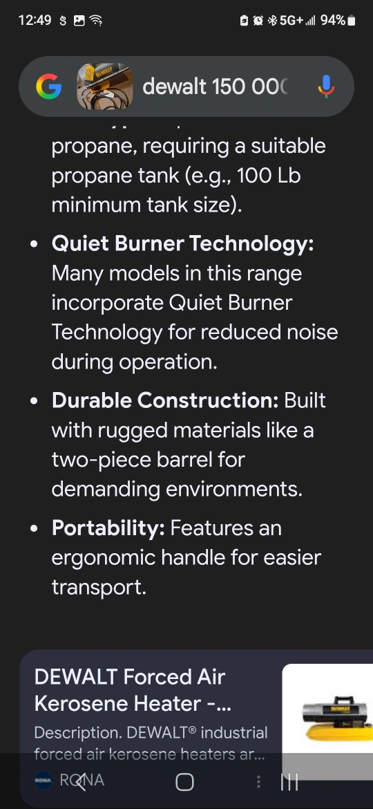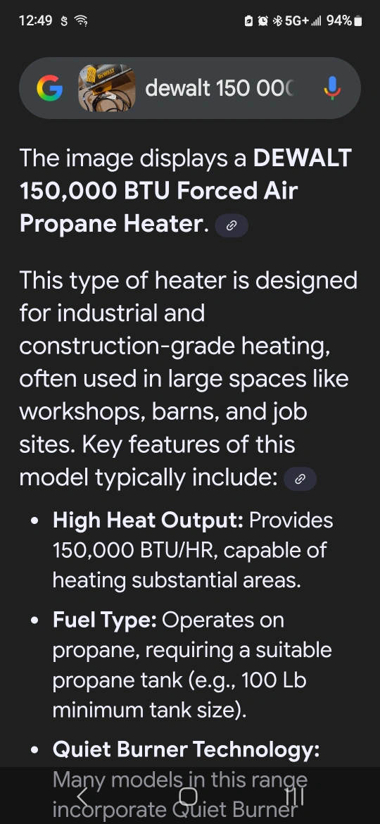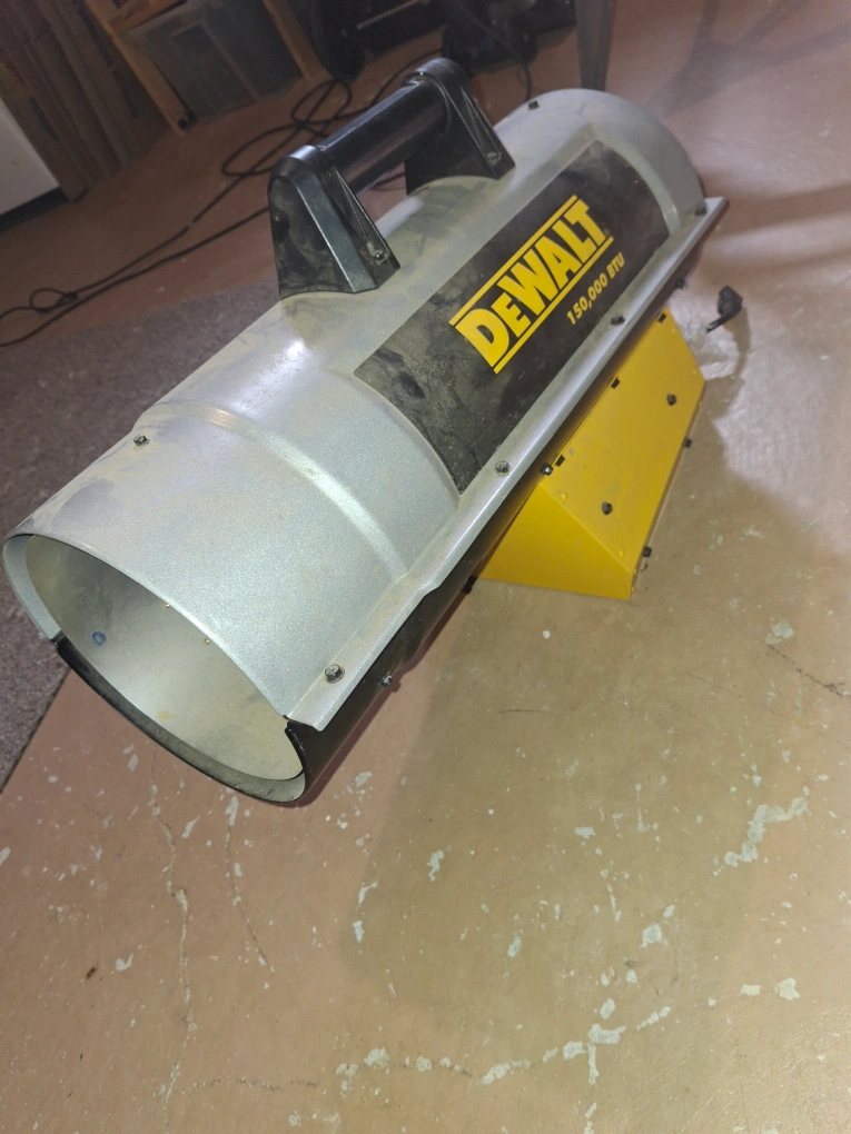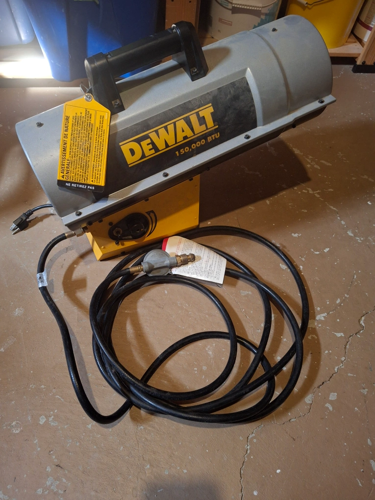 10Selling a DeWalt 150,000 BTU propane forced air heater. It's in good working condition and ready to keep you warm this winter. Perfect for garages, workshops, or construction sites! Bring propane bottle for testing