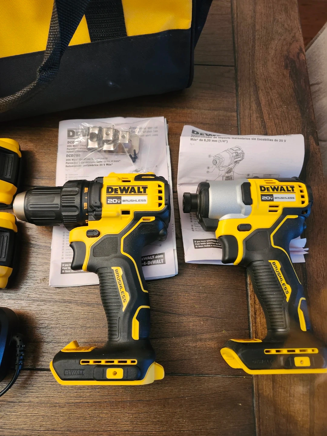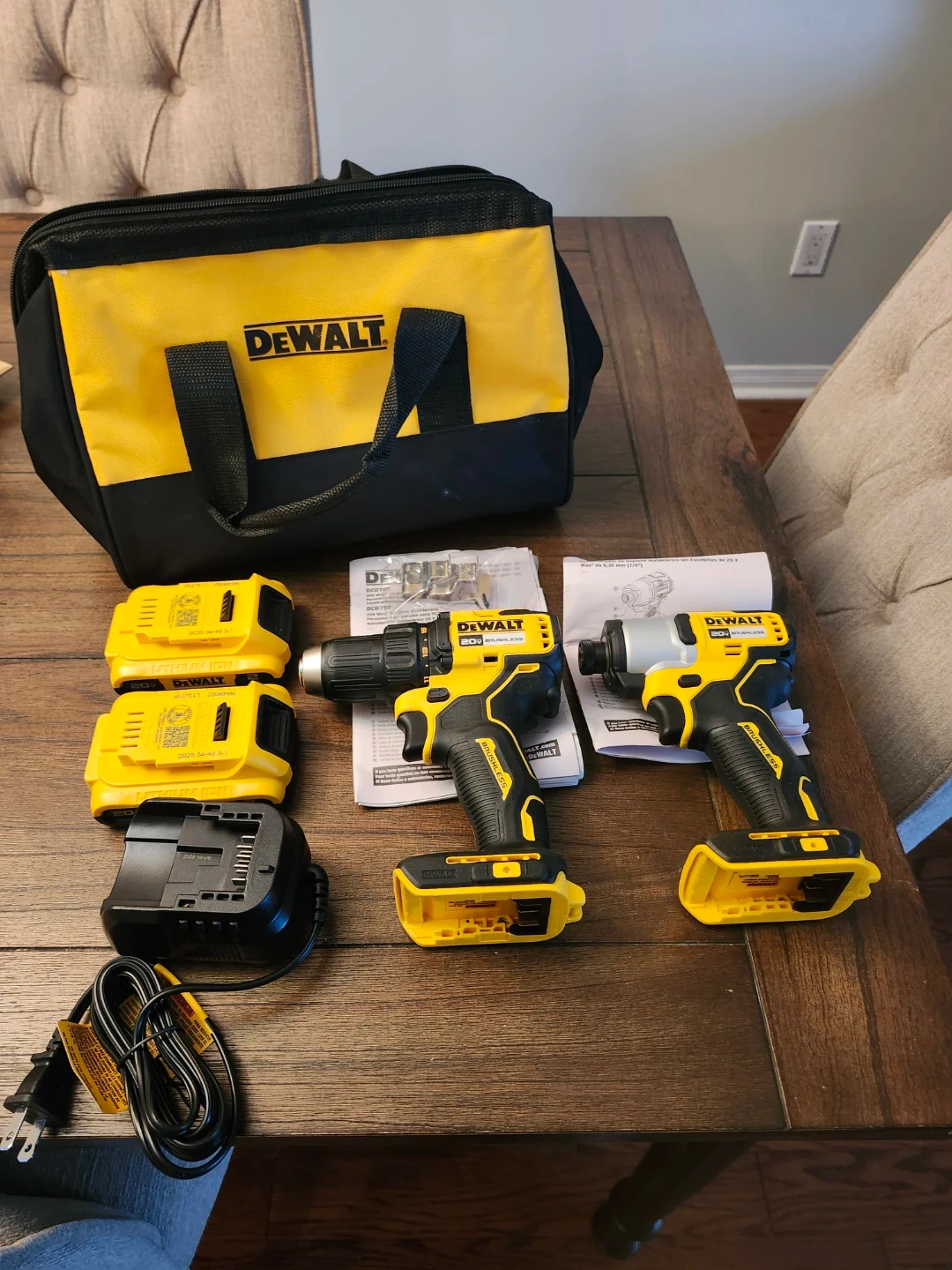 10Selling a DeWalt 20V Brushless cordless drill and impact driver kit! It comes with the drill, impact driver, two batteries, a charger, a bag, and the manuals. Great for any DIY projects around the house!clips for belt